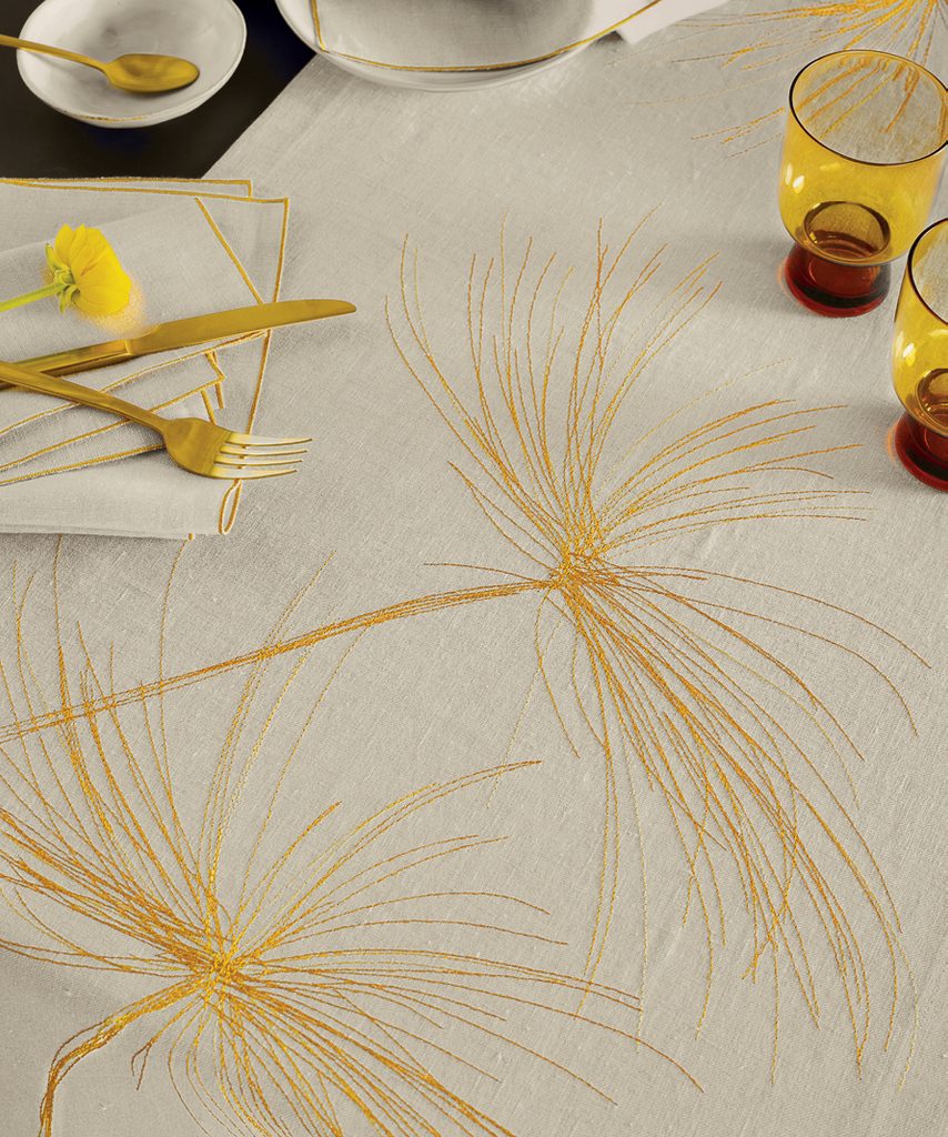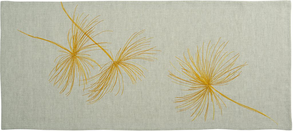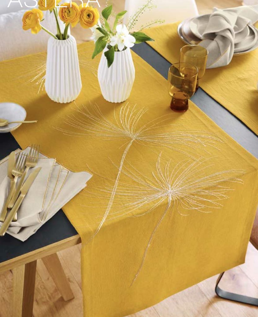 Krásný přírodní stolní běhoun Astera s unikátní výšivkou v trendy hořčicové barvě vyrobený ze 100% lnu. Astera spojuje eleganci, modernost a bude výjimečný při každém stolování. Interiér můžete doladit běhouny ve stejné nebo přírodní béžové barvě v jiné velikosti. Běhoun Astera je to pravé pro váš domov.