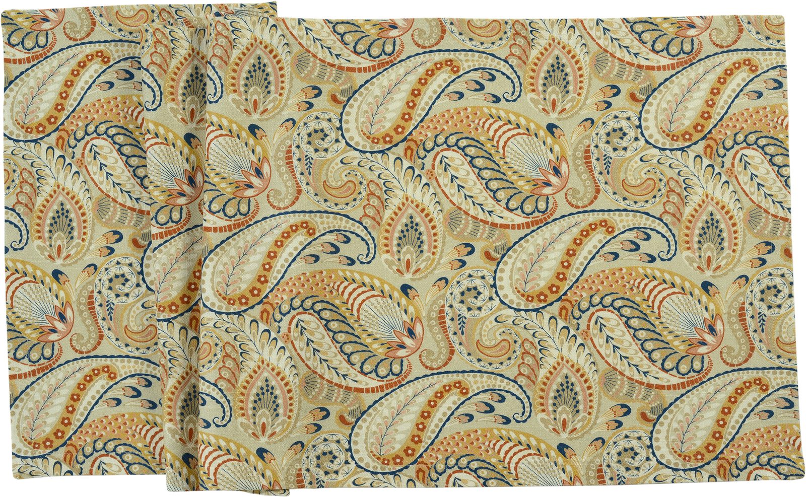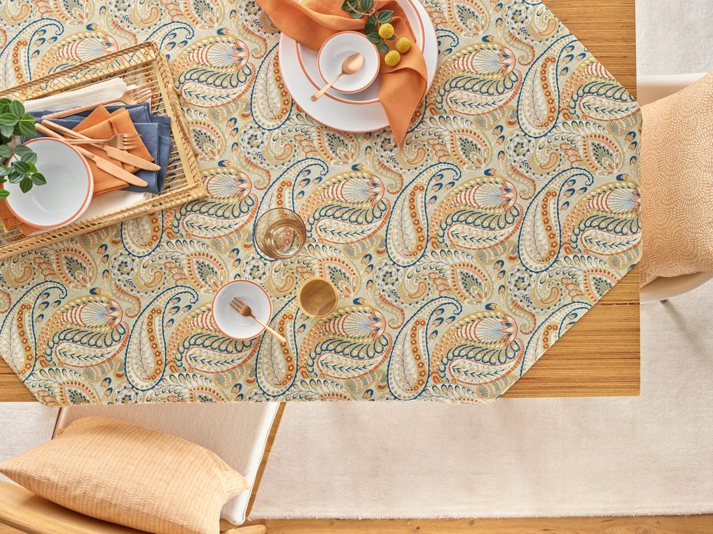 Oživte svůj stůl s elegantním běhounem Palia od značky Sander table+home. Tento běhoun s jemným paisley vzorem v teplých oranžových a modrých tónech dodá vaší jídelně nádech sofistikovanosti a svěžesti.