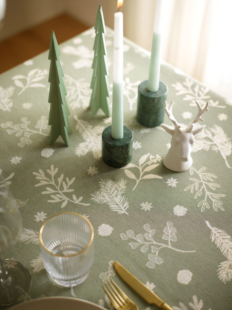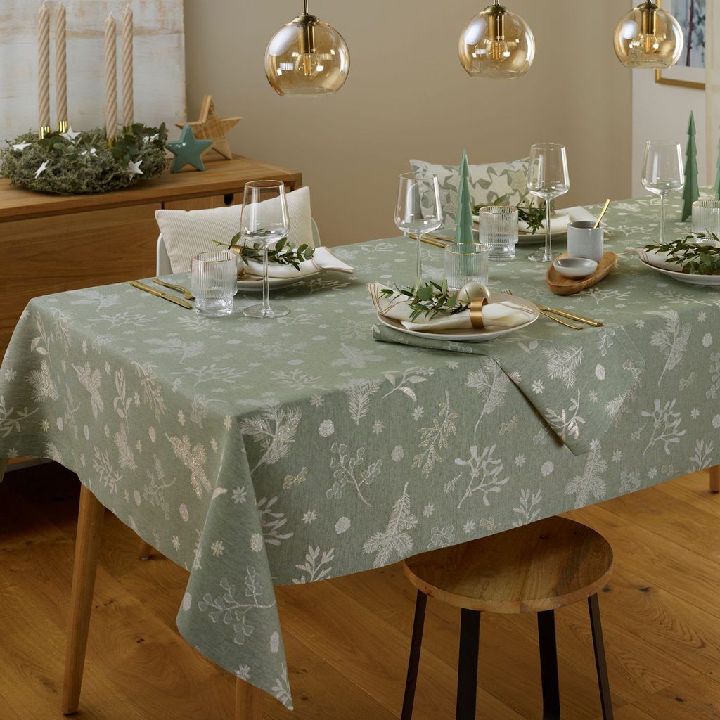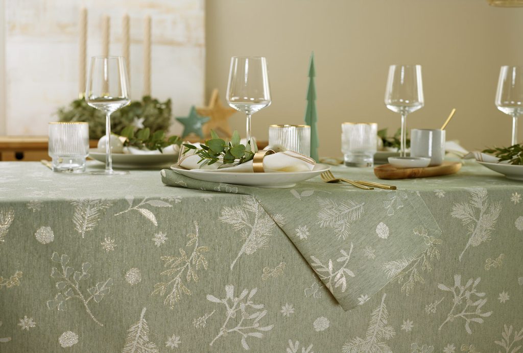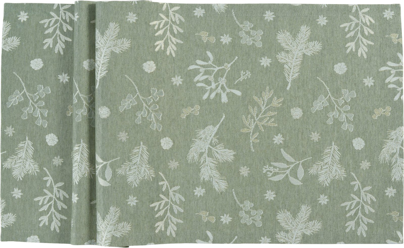 Vánoční zelený běhoun na stůl s větvičkami jehličí a jmelí z kolekce Pine. Běhoun s vánočním motivem se bude při stolovaní naprosto vyjímat a dodá tečku vaší sváteční večeři. Jemné vzory prošité zlatou lesklou nití okouzlí nejen vás, ale i vaše hosty