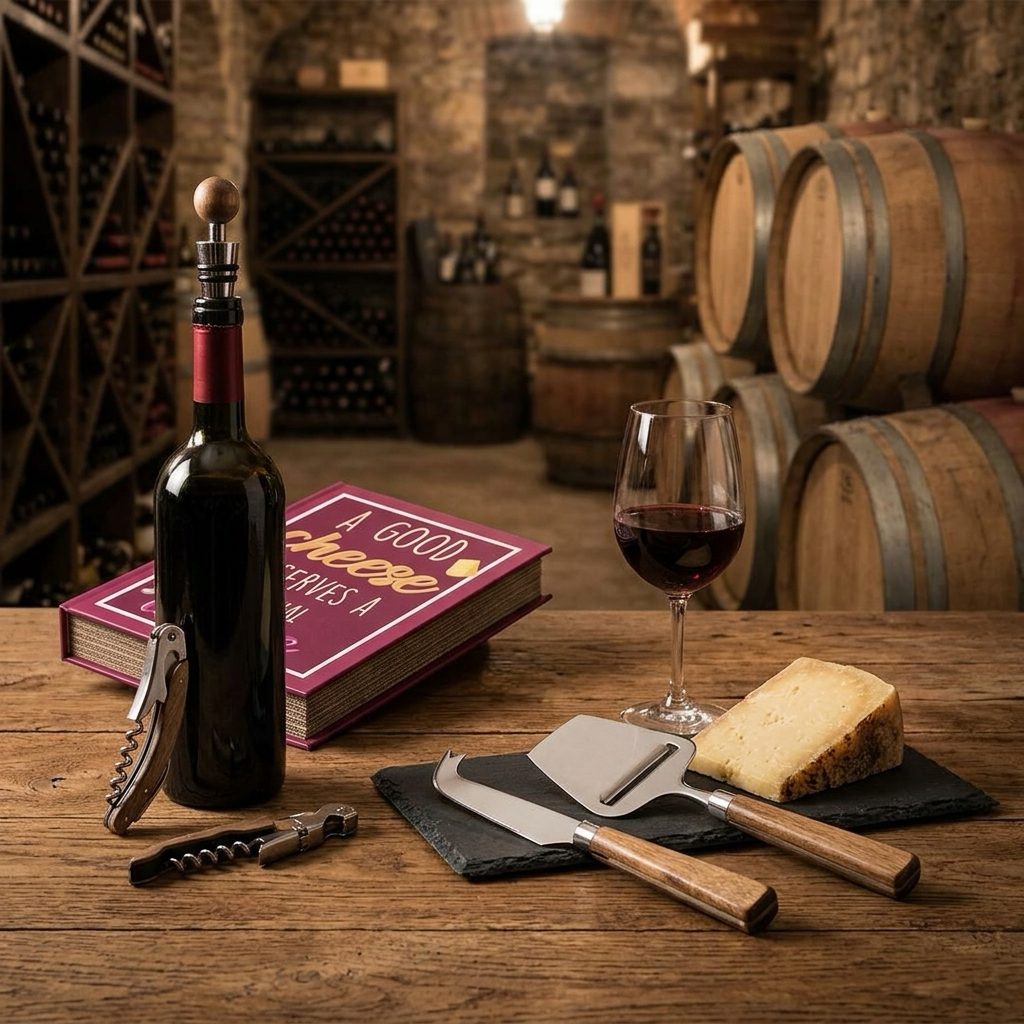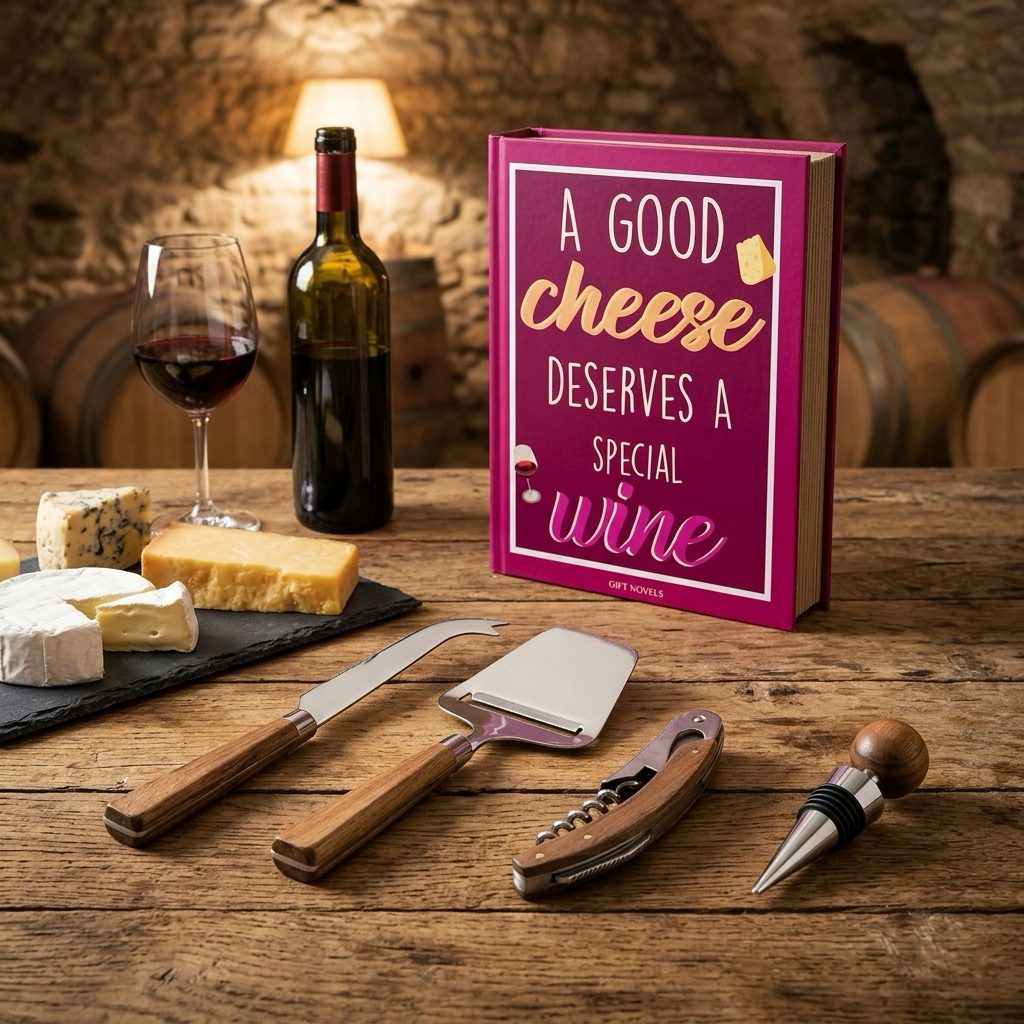 Stylová dárková sada na víno a sýry v originálním balení ve tvaru knihy potěší každého milovníka dobrého jídla a pití. Obsahuje 4 praktické nástroje z nerezové oceli s elegantními rukojeťmi z akáciového dřeva – ideální pro romantické večery, oslavy i jako vkusný dárek.