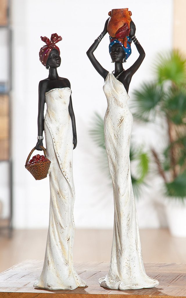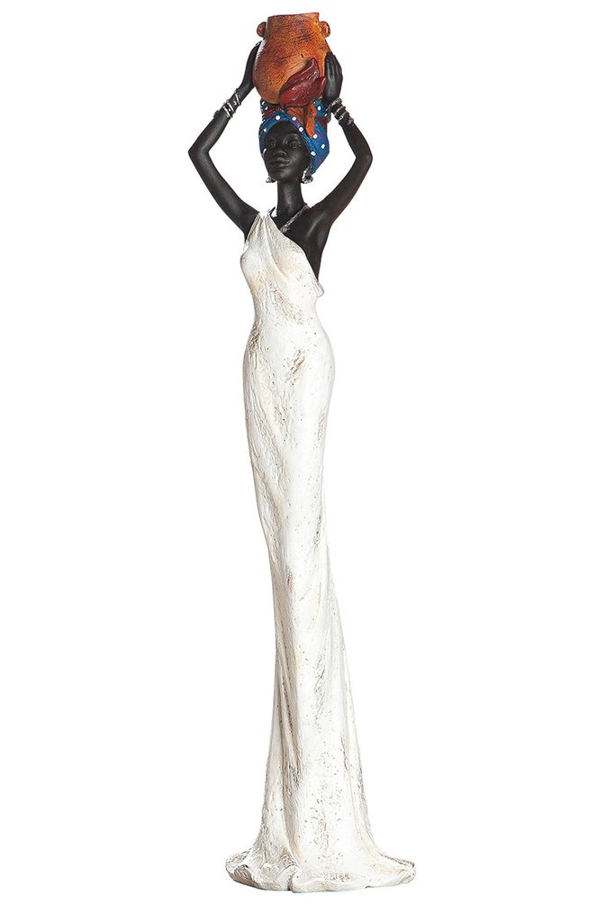 Dokonalá soška Afričanky Tortuga v bílých šatech, modrém šátku a s hnědým džbánem na hlavě. Tortuga se hodí do každého interiéru.