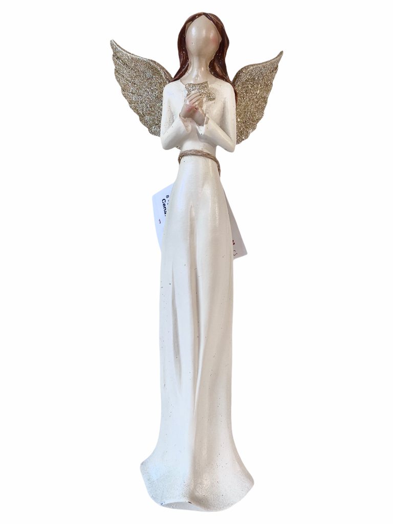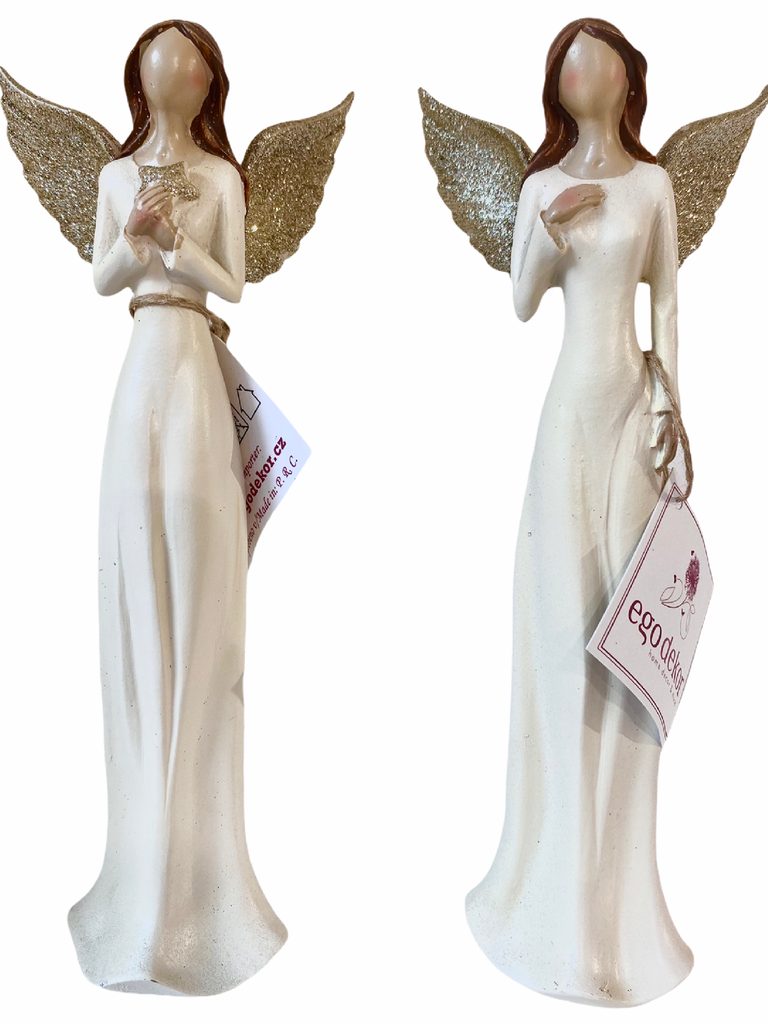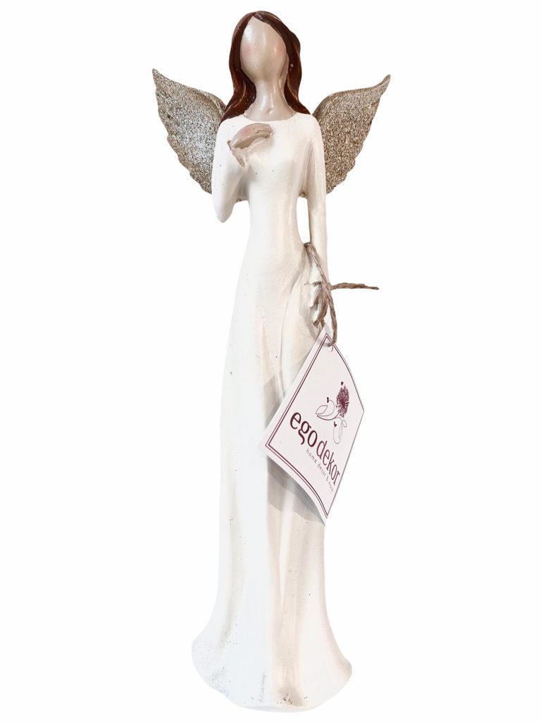 Krásný anděl Lea v dlouhých krémových šatech s velkými třpytící se zlatými křídly. Věnujte anděla strážného svým blízkým před ochranou všeho zlého, pro štěstí a pro radost, ale taky i jako bytový doplněk na každou polici.