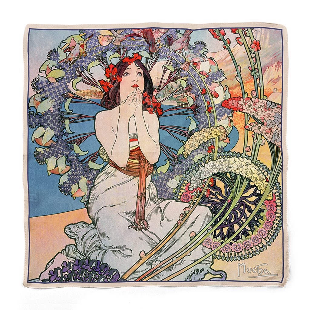 Luxusní hedvábný šátek Plumeria s motivem Monaco Monte Carlo od Alfonse Muchy. Elegantní doplněk z 100% přírodního hedvábí, který potěší milovníky umění i kvalitní módy. Zahalte se do stylu, který vás v zimě zahřeje a v létě ochladí.