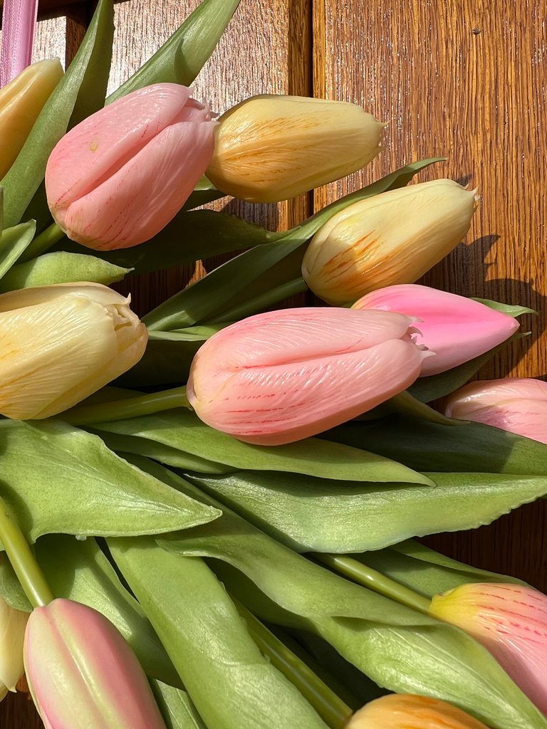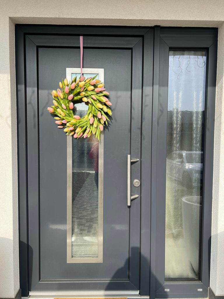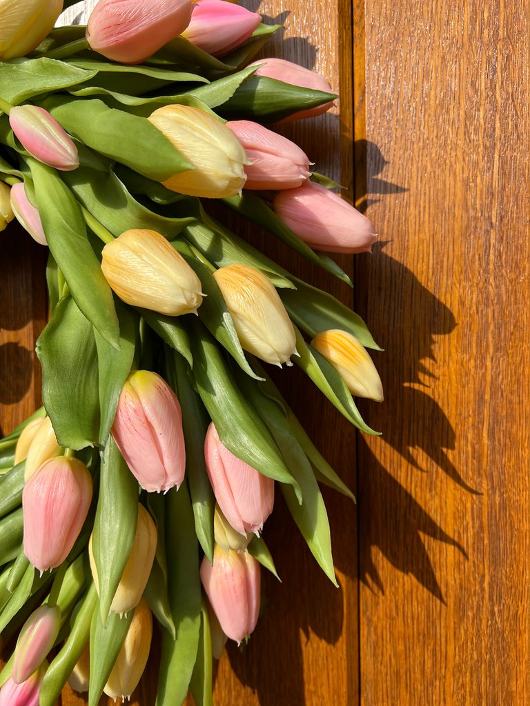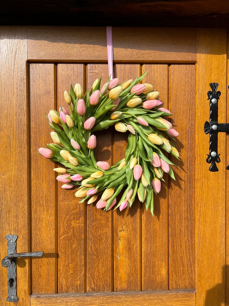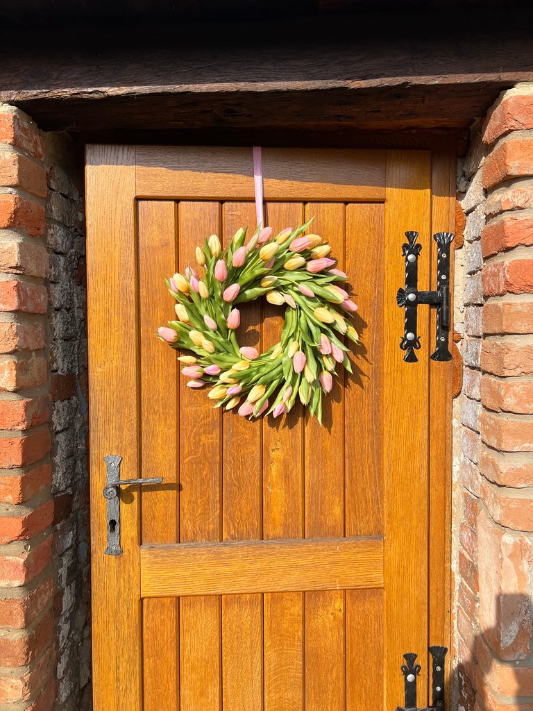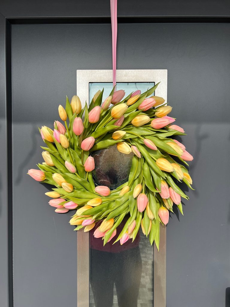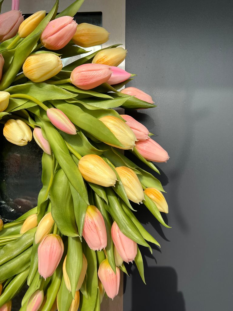 Jarní dekorace věnec na dveře silikonové tulipány růžovo-žlutý, 45-50cm