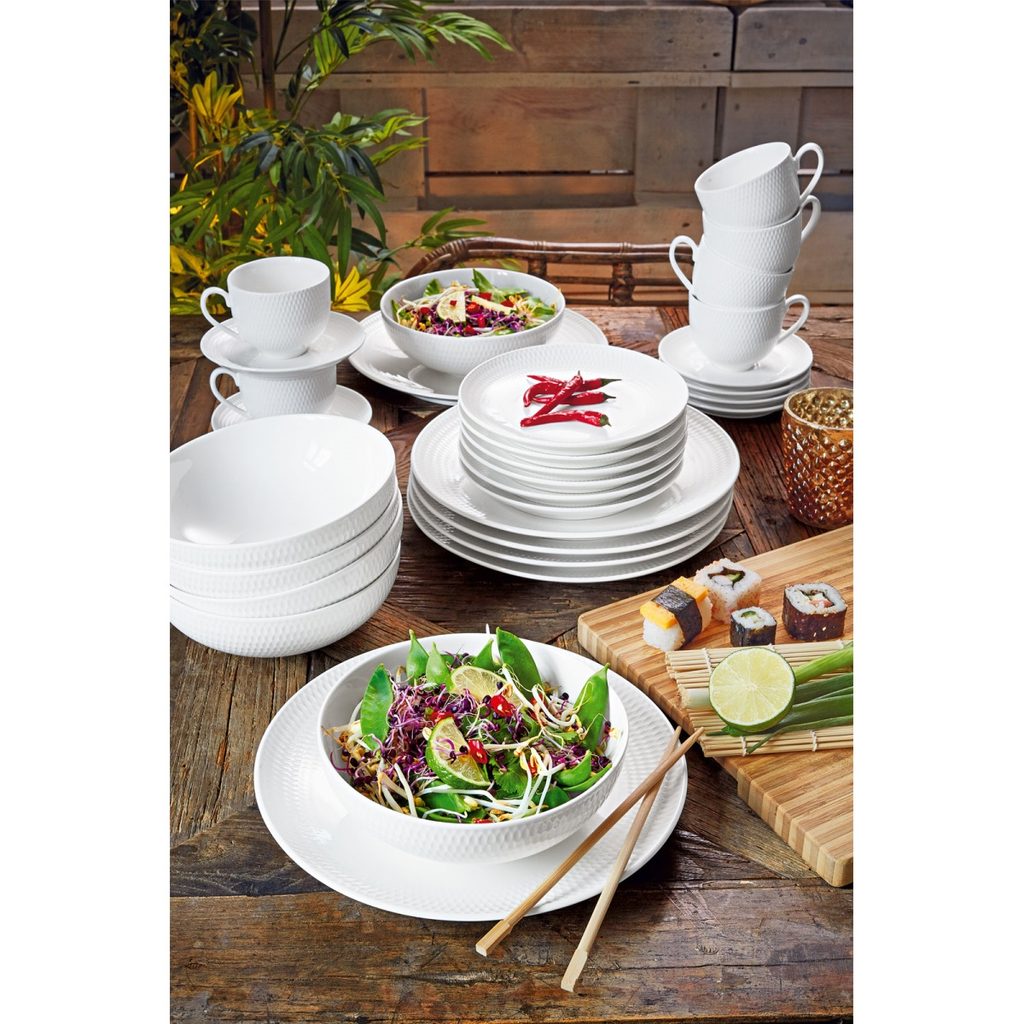 Elegantní a nadčasová kolekce White Basic Diamonds je vhodná pro každodenní stolování i slavnostní příležitosti. Na okraji nádobí jemně vystupuje pravidelná geometrická struktura a tvoří reliéf broušeného diamantu.