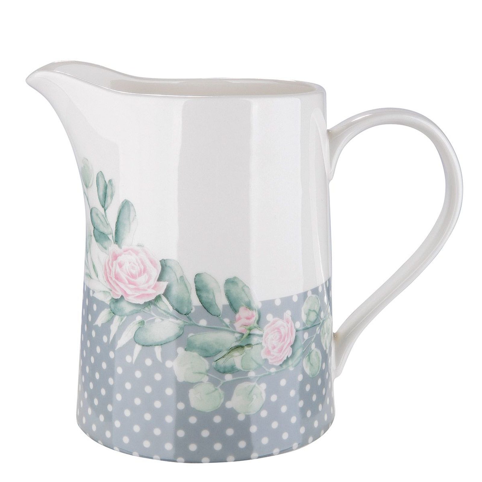 Porcelánový džbán se vzorem bílých puntíků na modrém podkladu a květinovou girlandou z růžových růží a zelených lístků na džbánu. Krásné jarní barvy a něžnost kolekce Botanic Chic. Vychutnejte si ledový čaj nebo limonádu z toho krásného džbánu. Džbán lze využít i jako květináč nebo váza na rozkvetlé tulipány. Džbán vytvoří i krásnou dekoraci.