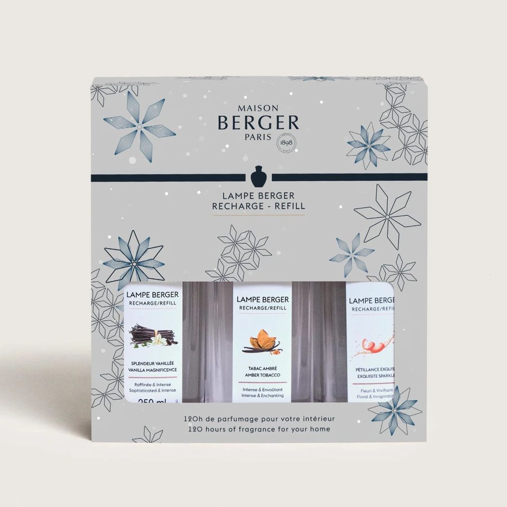 Objevte luxusní sadu tří parfému Maison Berger Paris do katalytické lampy (3×250 ml) – Ambrový tabák, Velkolepá vanilka a Intenzivní třpyt. Kombinace hřejivých, sladkých i jiskřivých tónů provoní váš interiér, odstraní nepříjemné pachy a promění domov v oázu pohody.
