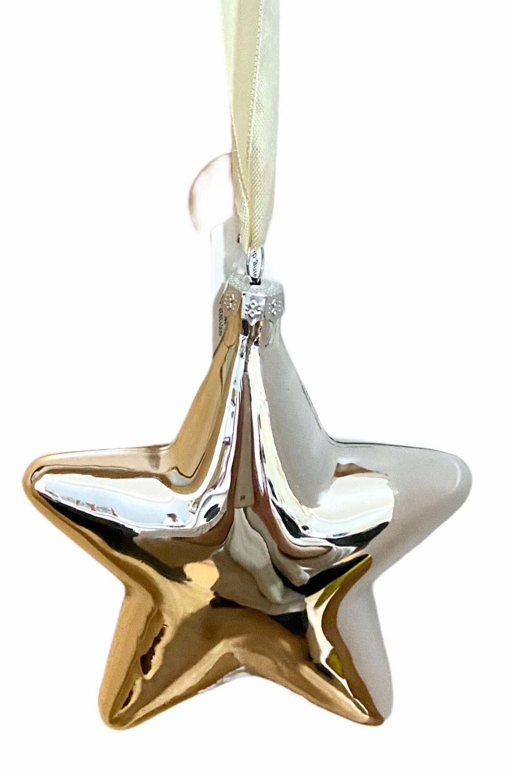 Krásná závěsná stříbrná ozdoba ve tvaru hvězdy na krémové stuze. Ozdoba je vyjímečná svou jednoduchostí. Vyzdobte si svůj vánoční stromeček těmito hvězdami.