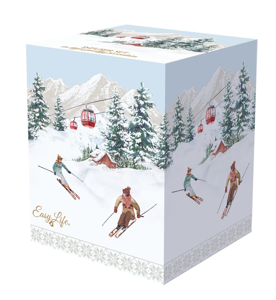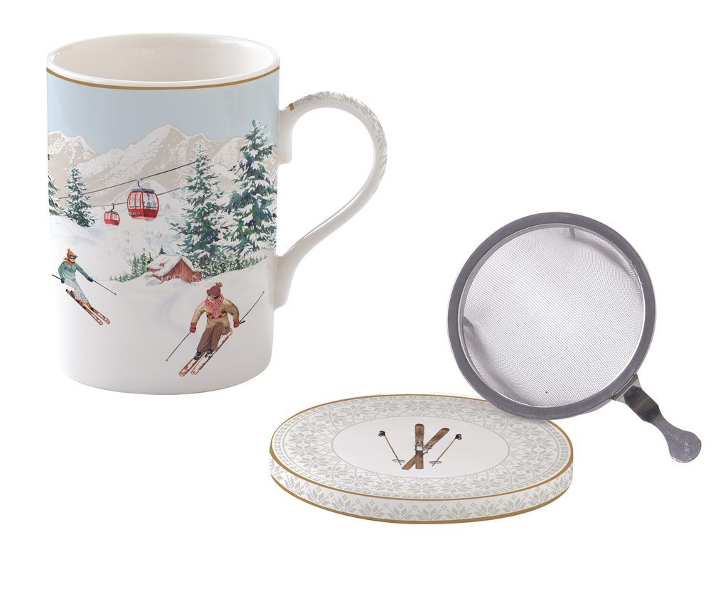 Porcelánový hrnek se sítkem a pokličkou z kolekce Chalet. Ideální pro milovníky čaje, kteří si chtějí užít zimní atmosféru s motivem lyžařů a zasněžené krajiny v dárkové krabičce.
