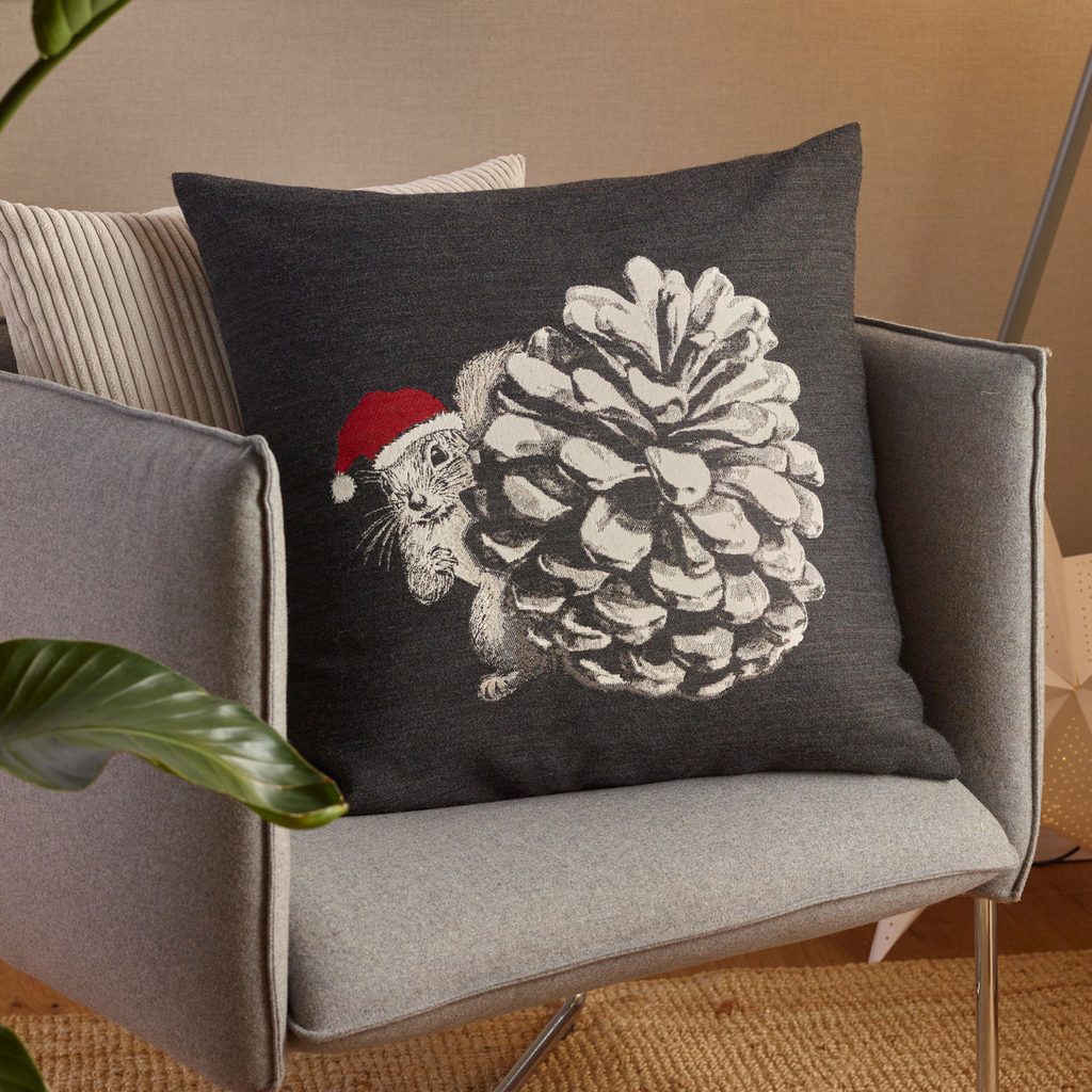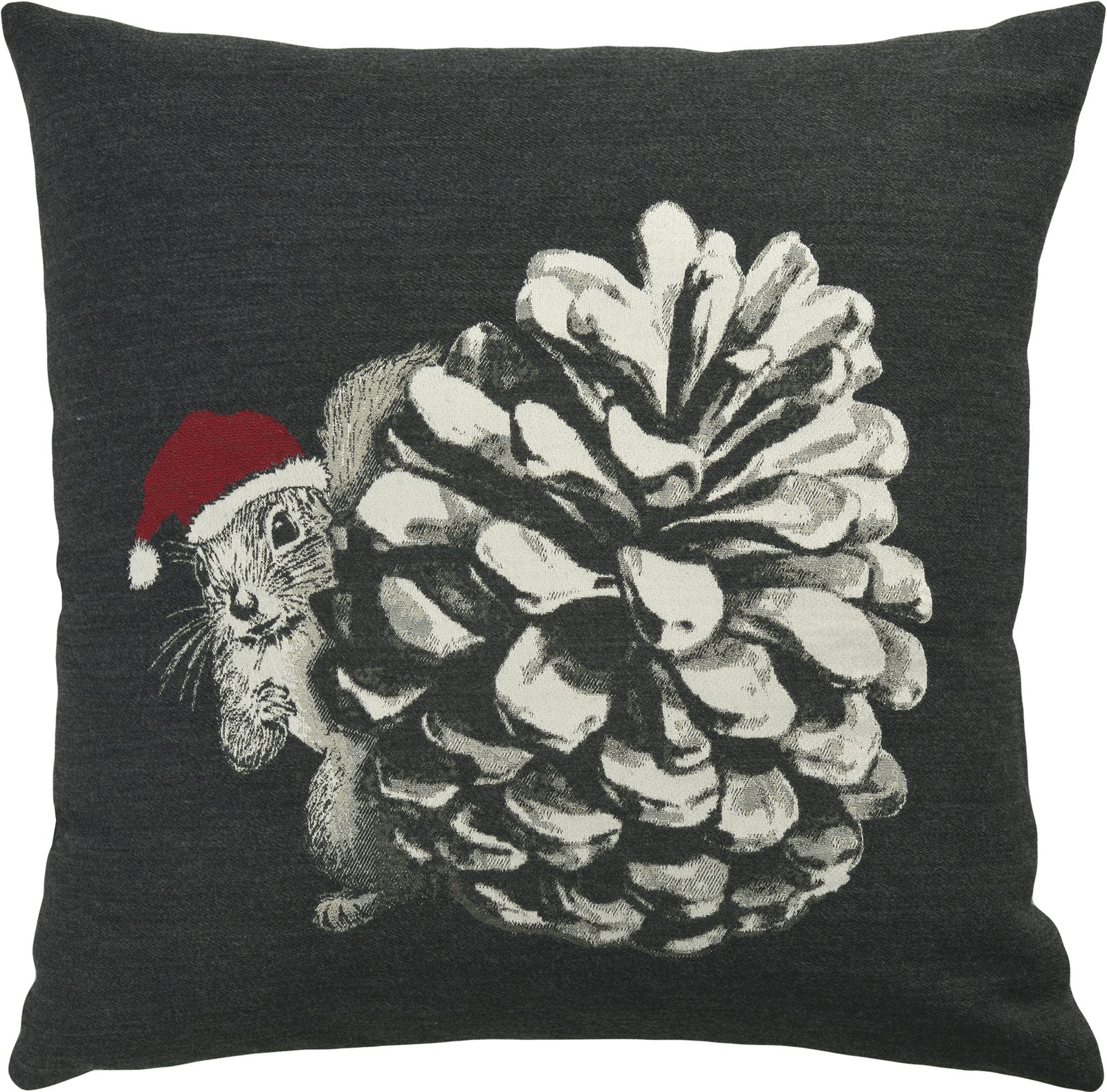 Dekorační potah na polštář Pigna s motivem veverky s vánoční čepicí a velkou šiškou, který přináší zimní atmosféru a roztomilost do každého interiéru. Ideální jako sezónní doplněk na vaši pohovku nebo křeslo.