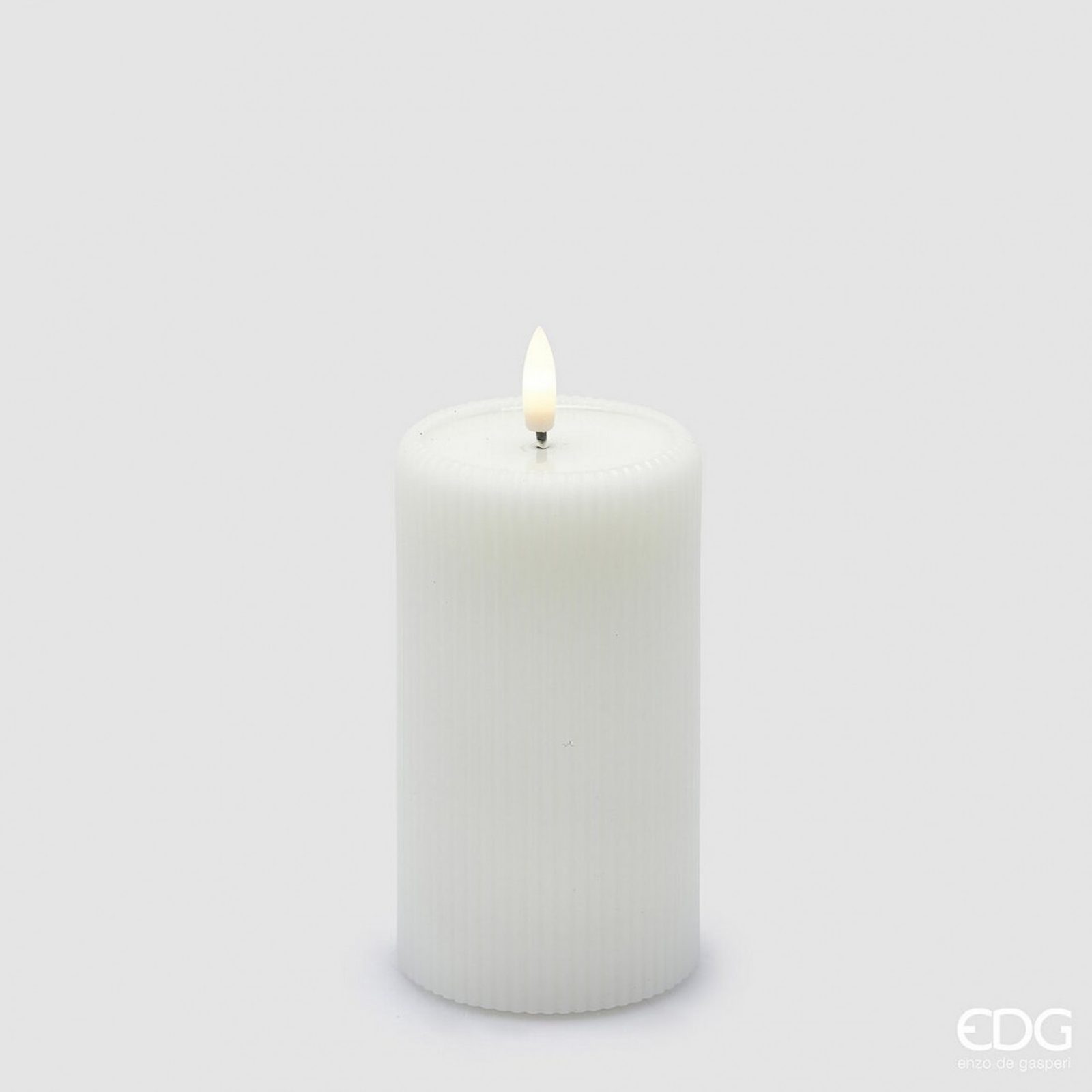 Tato dekorativní LED svíčka v elegantní bílé barvě má klasický válcovitý tvar a jemně rýhovaný povrch, který působí sofistikovaně a stylově. Na horní straně svíčky se nachází plastické jezírko připomínající rozpuštěný vosk, díky kterému je její vzhled téměř nerozeznatelný od pravé svíčky. Plamen lehce mihotá a dodává celkovému dojmu maximální přirozenost.