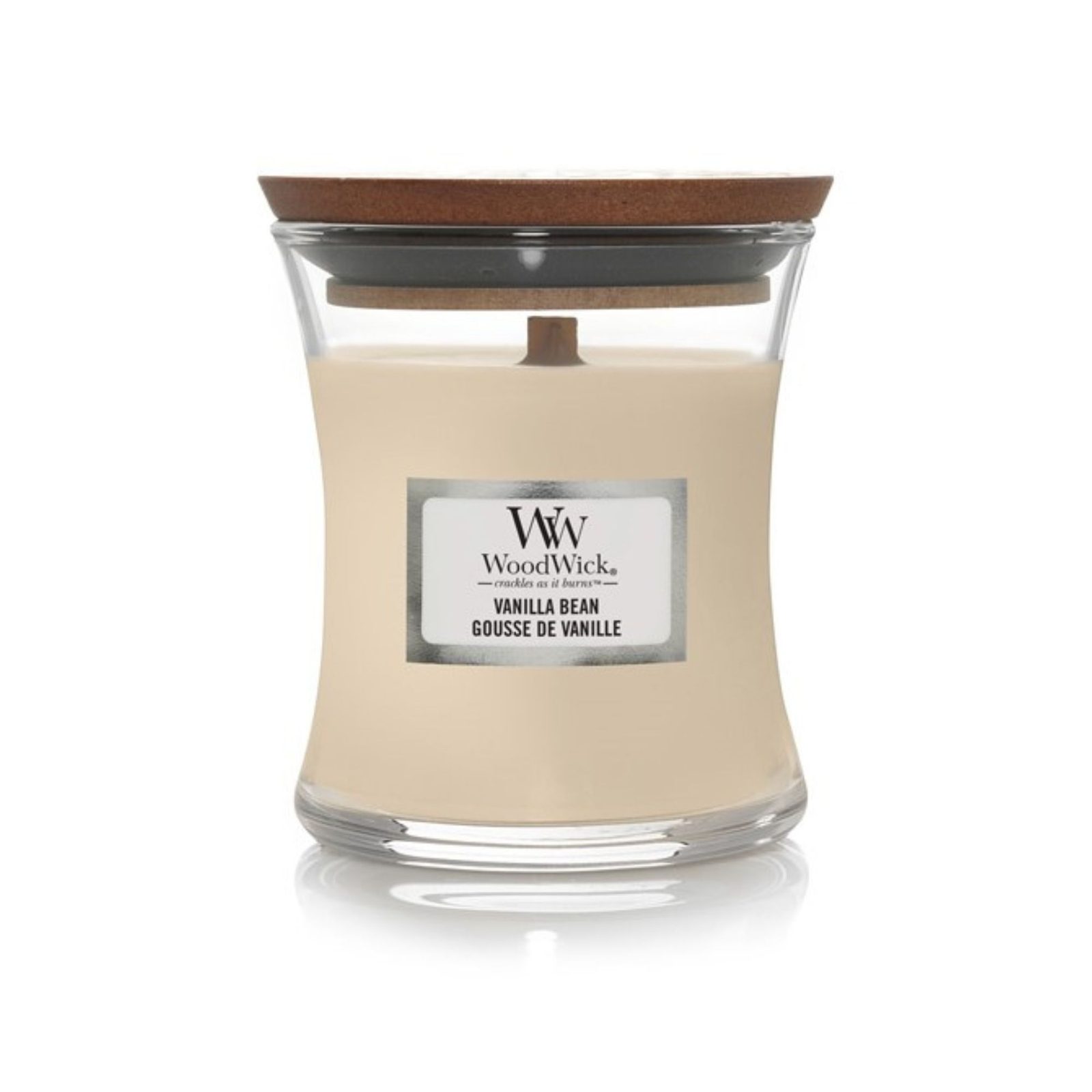 Vonná svíčka ve tvaru malé vázy s dřevěným knotem WoodWick s vůní vanilkového lusku. Odpočiňte si u hřejivé a přírodní vůně vanilkového lusku.