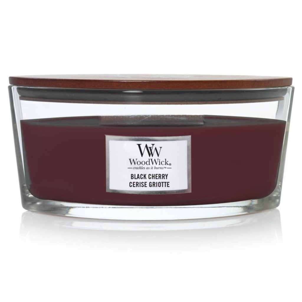 Vonná svíčka ve tvaru lodičky s dřevěným knotem WoodWick s vůní černé třešně. Sladká a příjemná vůně šťavnatých černých třešní.