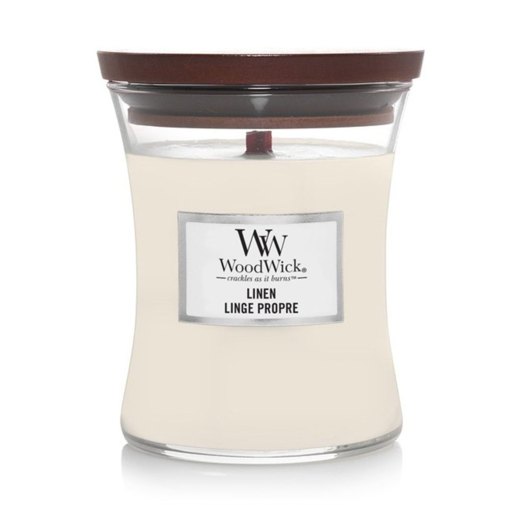 Vonná svíčka ve tvaru střední vázy s dřevěným knotem WoodWick s vůní prádla. Uklidňující vůně čistého prádla, které schne v jemném letním větříku.