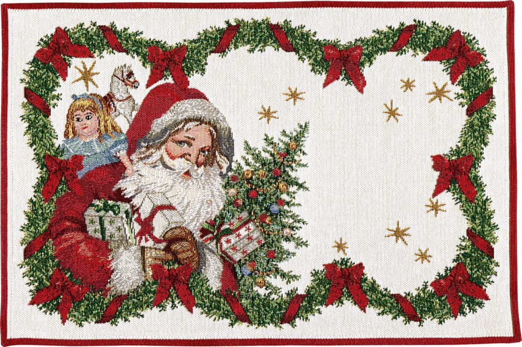 Vánoční gobelínová prostírka z kolekce Toy's Fantasy s motivem Santy Clause, panenky, koníka a ozdobená girlandou s červenými mašlemi. Ideální dekorace pro slavnostní stůl, která přinese kouzlo Vánoc do vašeho domova. Prostírání od Villeroy & Boch patří mezi novinky 2024 a skvěle zpestří váš prostřený stůl.