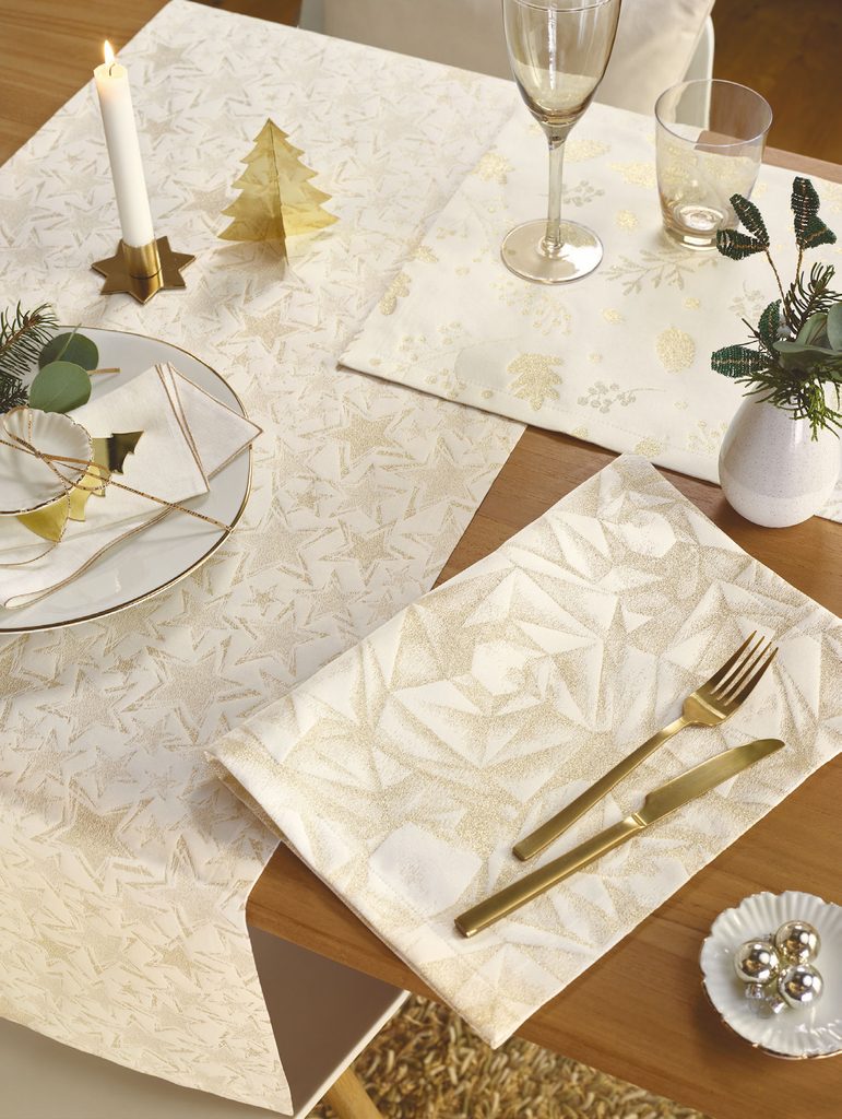 Luxusní vánoční běhoun na stůl Diamanti s geometrickým vzorem diamantů, který dodá vašemu stolu moderní a elegantní vzhled. Vylepšete vzhled svého svátečního stolu běhounem ve zlaté barvě a vychutnejte si slavnostní stolování.