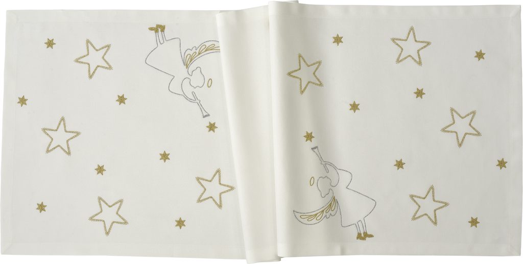 Exkluzivní vánoční běhoun na stůl Stardust bílý 50x150 cm od značky Sander table&home. Vyroben v Německu z prémiového materiálu LOFT, zdobený ručně aplikovanou zlatou výšivkou s motivem andělů a hvězd. Elegantní doplněk, který rozzáří vaše slavnostní stolování.