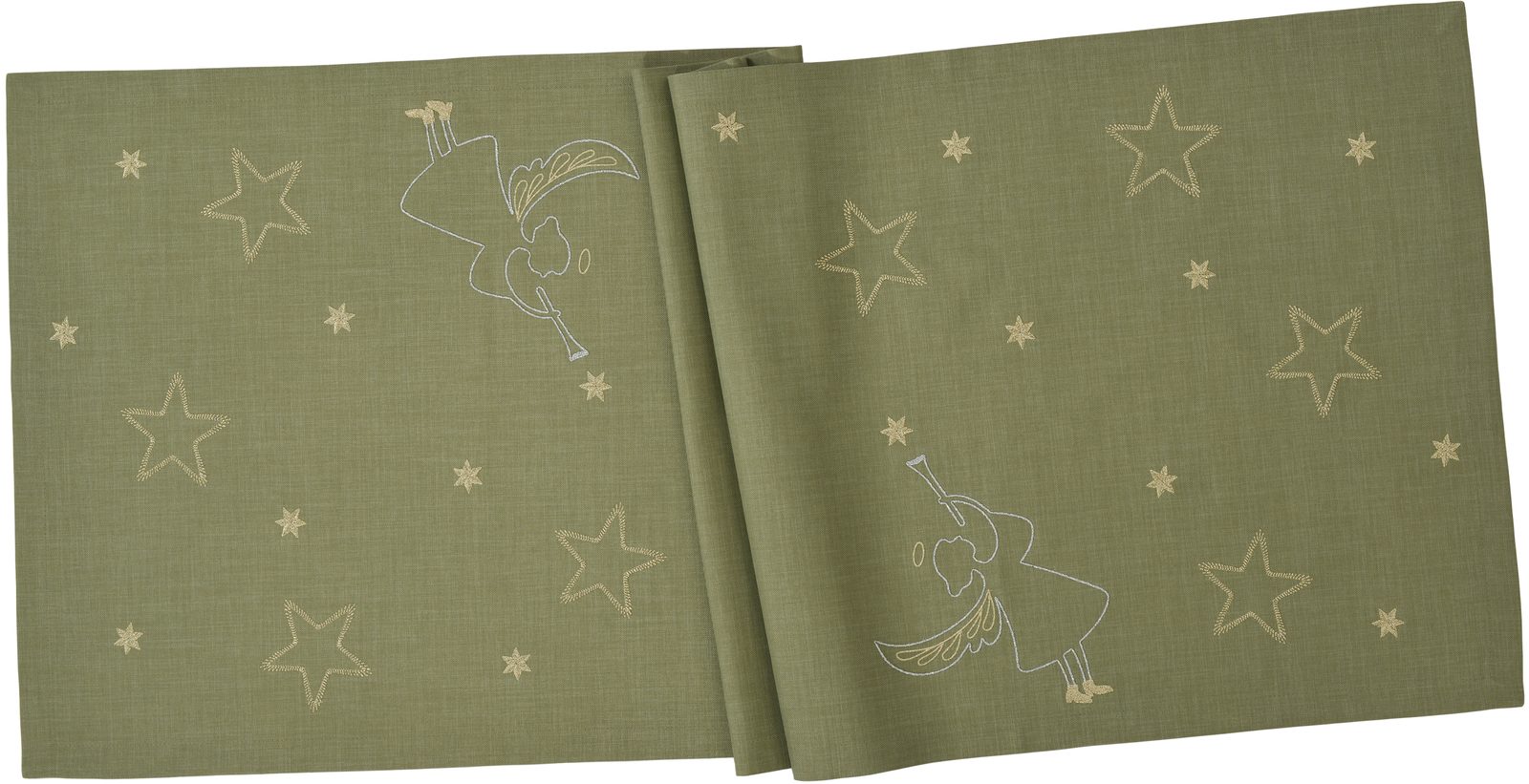 Exkluzivní vánoční běhoun na stůl Stardust zelený 50x150 cm od značky Sander table&home. Prémiová kvalita vyrobená v Německu, zdobený ručně aplikovanou zlatou výšivkou s motivem andělů a hvězd. Elegantní dekorace, která vnese do vašeho domova kouzlo Vánoc.