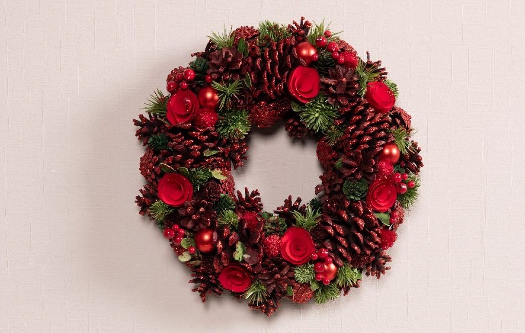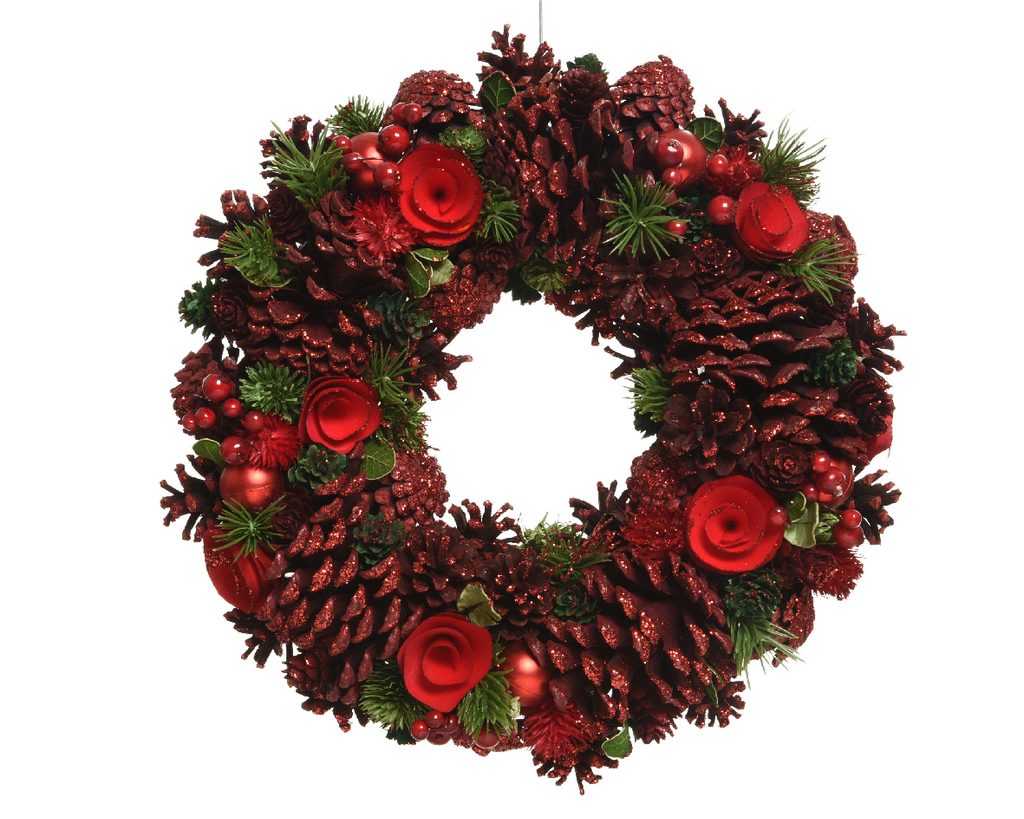 Luxusní vánoční věnec v červené barvě s ozdobami, šiškami a růžemi, ideální pro slavnostní výzdobu dveří nebo interiéru.