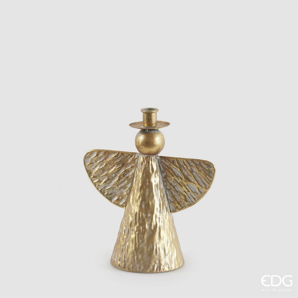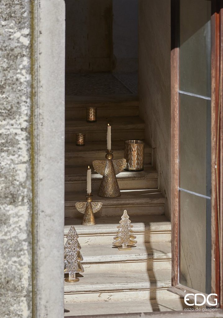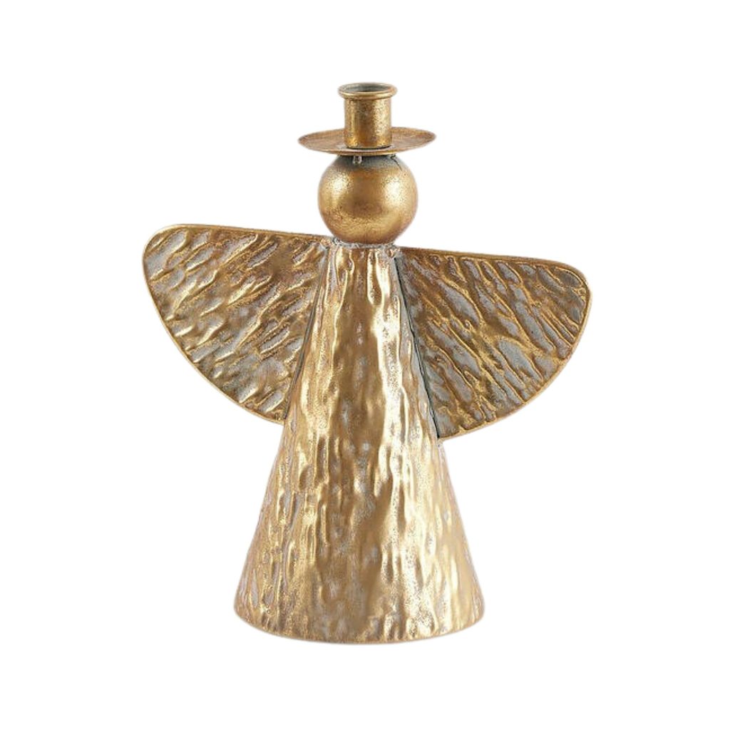 Elegantní kovový anděl ve zlatém provedení spojuje krásu vánoční dekorace a funkčnost svícnu. Decentní lesk, tepaný povrch a čisté linie dodají vašemu interiéru noblesu i klid. Ideální doplněk pro sváteční chvíle u světla svíčky.