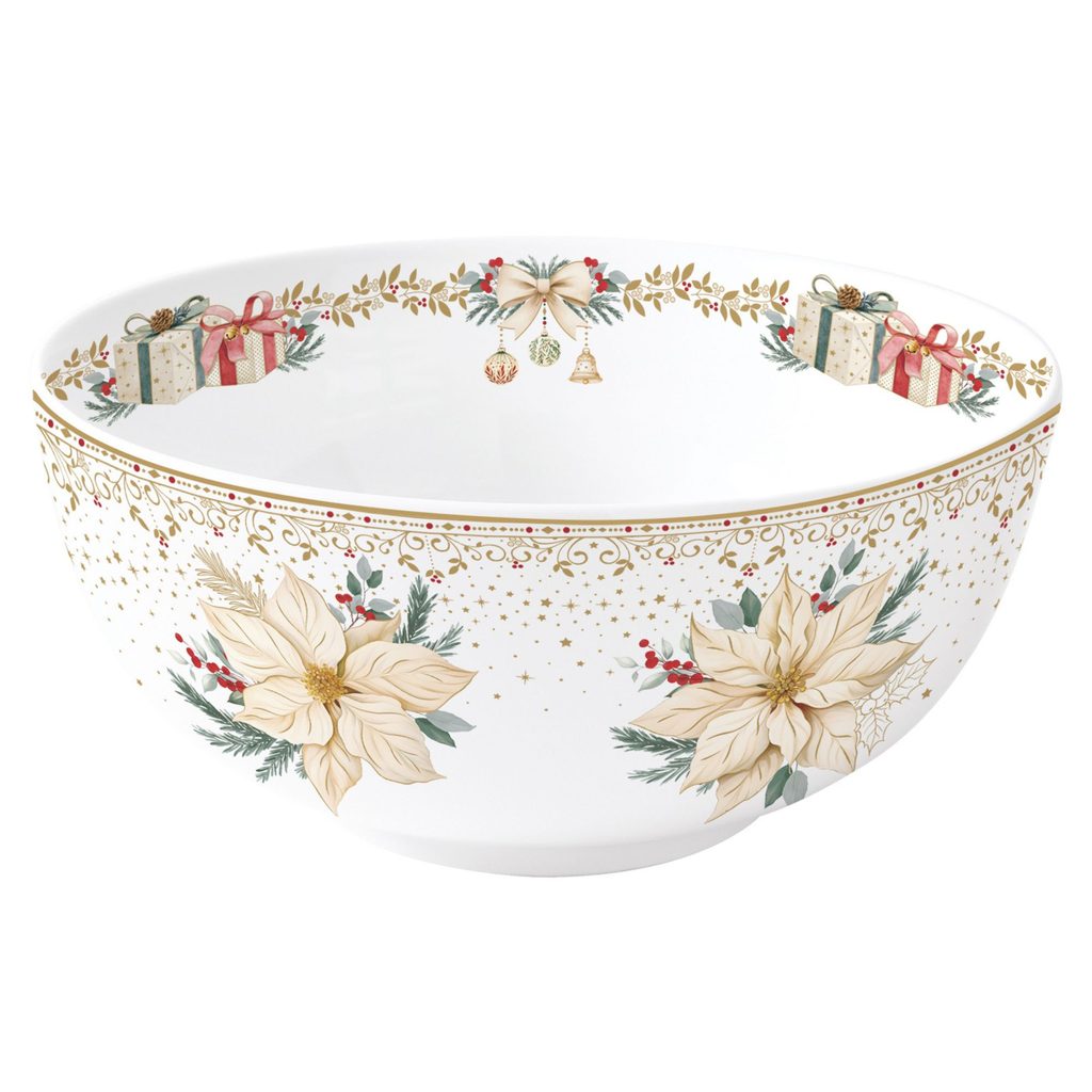 Elegantní vánoční porcelánová mísa z kolekce White Elegance od značky Easy Life, rozměr 23×10,3 cm. Bohatě zdobená bílými vánočními hvězdami, dárky, zlatými hvězdičkami a svátečními motivy. Skvělá na saláty, cukroví, ovoce či vánoční punč.