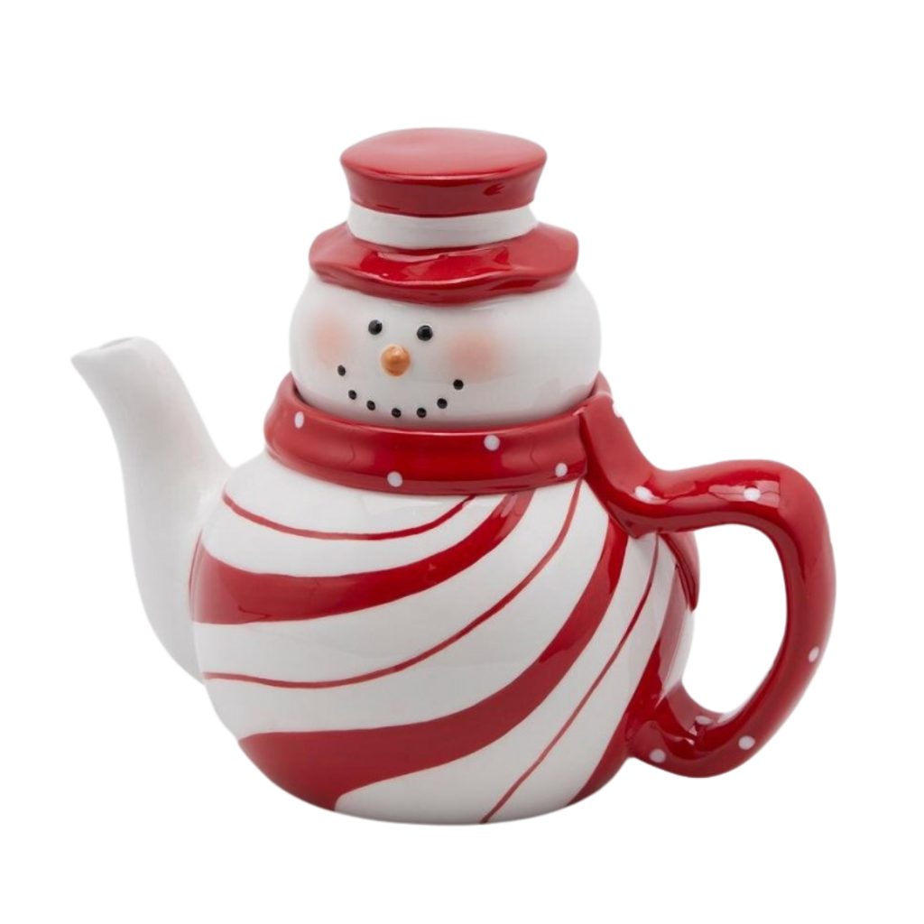 Veselá vánoční čajová konvice ve tvaru sněhuláka s červenobílým designem, ideální pro zimní pohodu.