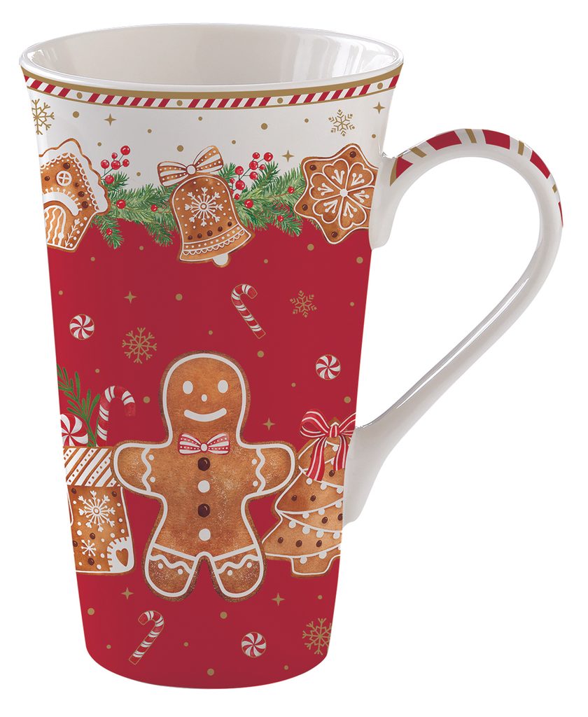 Vánoční porcelánový jumbo hrnek s motivem perníčků z kolekce Fancy Gingerbread, dodávaný v elegantní dárkové krabičce. Perfektní pro velkou porci čaje či kávy.