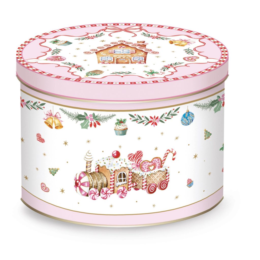 Vánoční porcelánový hrnek z kolekce Sweet Christmas od značky Easy Life s motivem perníkové chaloupky, veselých perníčků, Louskáčka a vláčku. Dodáváno v krásné plechové dóze.