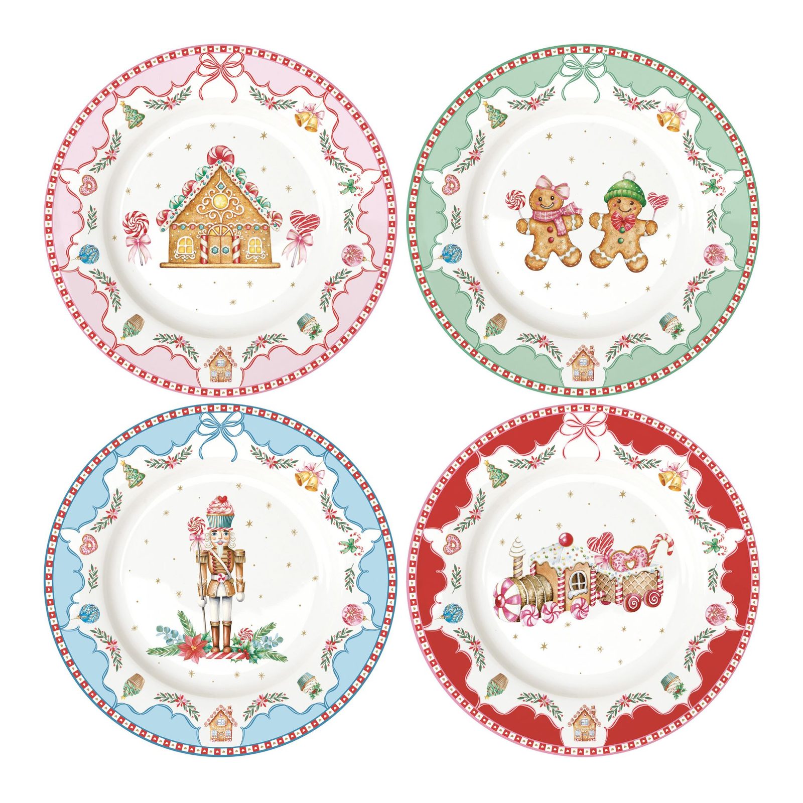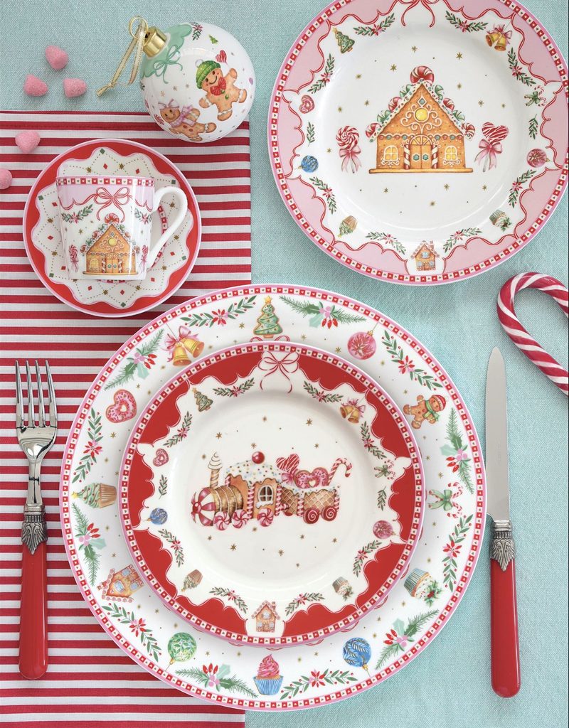 Vánoční sada 4 porcelánových dezertních talířů z kolekce Sweet Christmas od značky Easy Life přináší radost a hravost na váš sváteční stůl. Každý talíř (Ø 19,5 cm) má jiný veselý motiv – perníkovou chaloupku, vánoční vláček, perníčky a louskáčka – a je uložen v krásné dárkové krabičce.