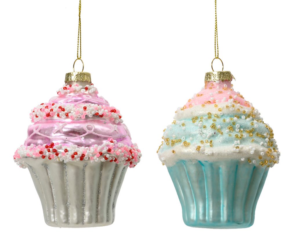 Dopřejte svému vánočnímu stromečku kouzlo sladkých Vánoc s těmito krásnými skleněnými ozdobami. Dvě originální dekorace ve tvaru cupcaku v cukrové růžové a modré barvě s třpytivými pruhy dodají vašim svátkům jiskru a veselou atmosféru. Skleněné ozdoby jsou precizně vyrobené s důrazem na detail, doplněné korálkovým posypem, který zvýrazní jejich eleganci. Perfektní pro zdobení vánočního stromečku nebo jako stylová vánoční dekorace do interiéru. Ideální volba pro milovníky tradičních Vánoc i moderního designu.