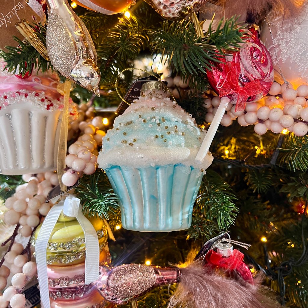 Skleněná vánoční ozdoba ve dortíku. Dekorace ve tvaru cupcaku ve sladké růžové a modré barvě s třpytivými detaily a posypem, která přidává eleganci vašemu vánočnímu stromečku.