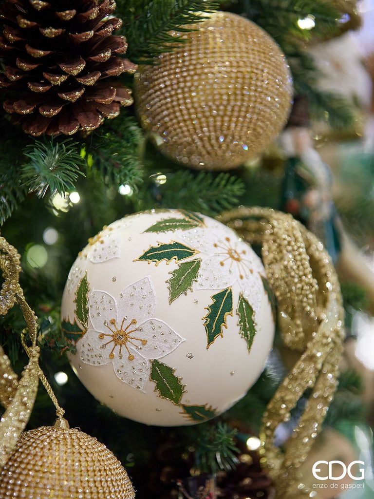 Tato luxusní vánoční koule přináší do vaší výzdoby nádech elegance a sofistikovanosti. S jemným motivem bílých květů a zelených listů s detaily ve zlaté a stříbrné barvě působí jako umělecké dílo, které ozdobí váš vánoční stromek.