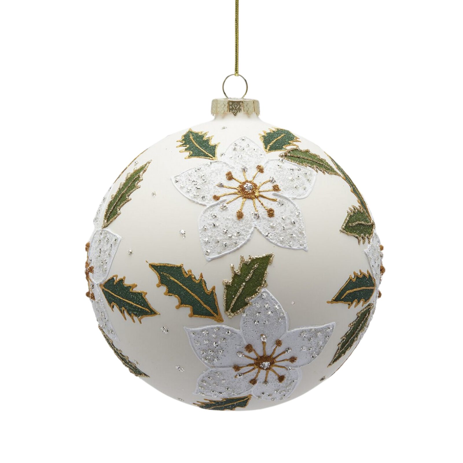 Elegantní vánoční koule zdobená bílými květy a zelenými listy s třpytivými detaily, která dodá stromku slavnostní půvab.