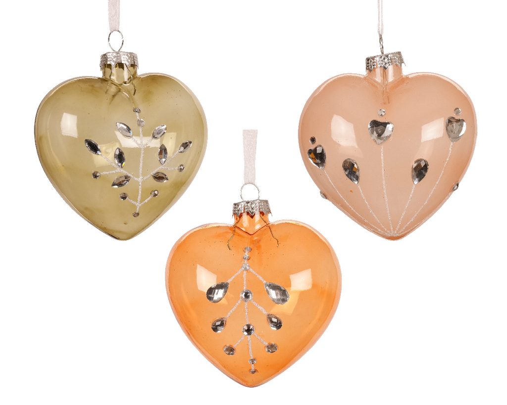 Skleněná vánoční ozdoba ve tvaru srdce s jemným dekorem a třpytivými kamínky. Elegantní ozdoba na vánoční stromeček, do aranžmá i jako dárek.