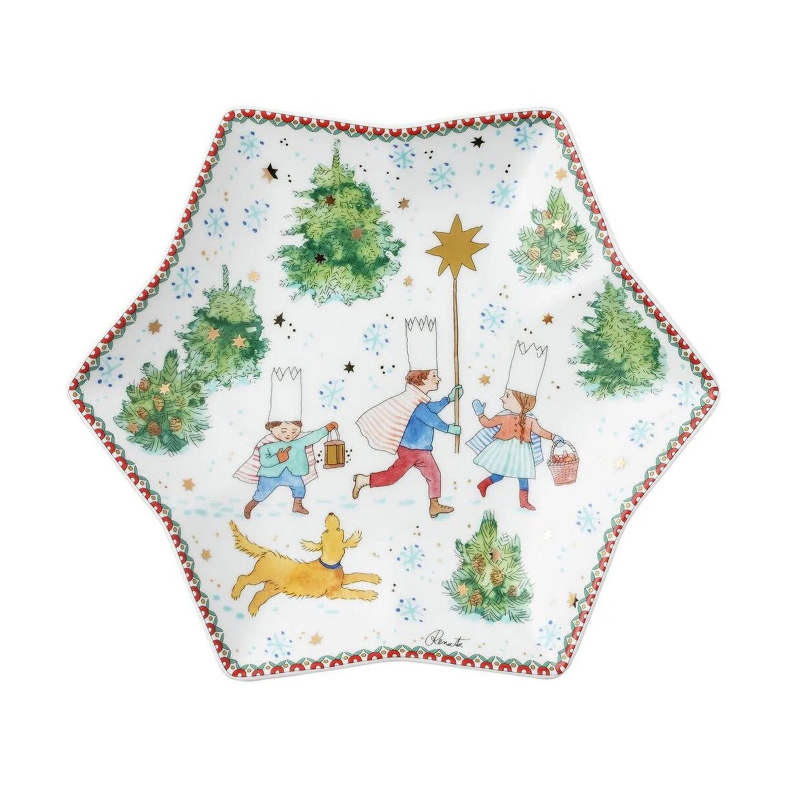 Vánoční porcelánový talíř ve tvaru hvězdy o průměru 24 cm na servírování cukroví. Talíř je součástí výroční sběratelské kolekce Christmas Games / Vánoční radovánky 2025, ilustrovaný českou výtvarnicí Renátou Fučíkovou pro porcelánku Hutschenreuther firmy Rosenthal. Tato již 8. kolekce skvěle doplní vaši předchozí sbírku.