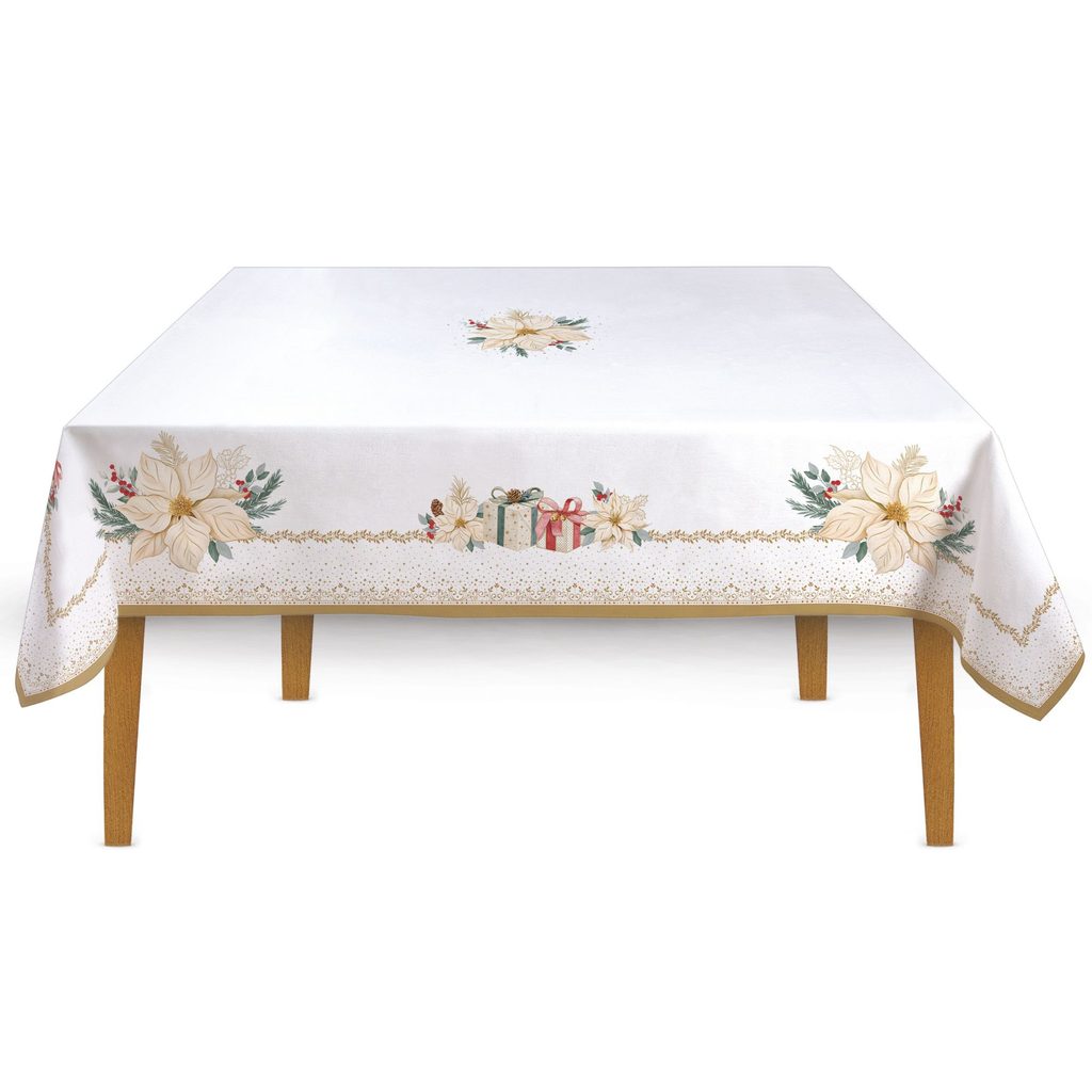 Vánoční bavlněný ubrus White Elegance od značky Easy Life v rozměru 180×145 cm přinese vašemu svátečnímu stolování kouzlo a eleganci. Jemný motiv bílé vánoční hvězdy, zlatých hvězdiček a dárků dodá vašemu stolu luxusní vzhled.
