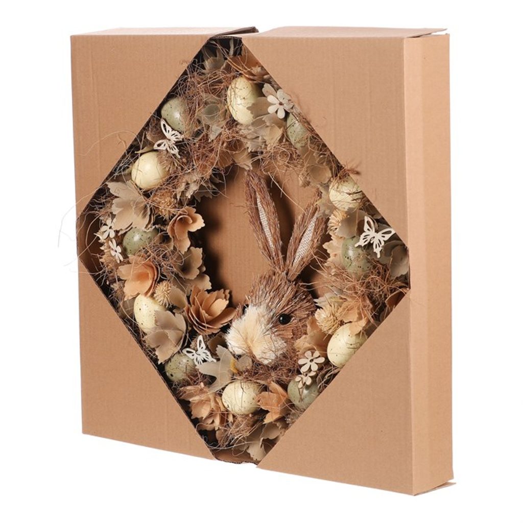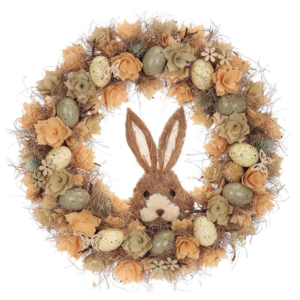 Velikonoční dekorace věnec s květy a zajícem přírodní, 45 cm