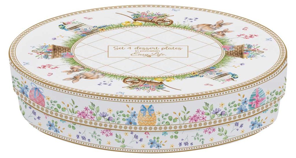 Sada čtyř porcelánových dezertních talířů z kolekce Spring Bloom od italské značky Easy Life, zdobená jemnými jarními motivy. Každý talíř má unikátní design a pastelový okraj. Dodáváno v elegantní dárkové krabičce – ideální jako krásný dárek nebo stylový doplněk velikonočního stolování.