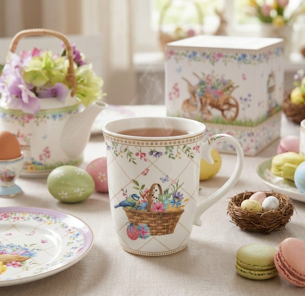 Porcelánový hrnek z kolekce Spring Bloom od italské značky Easy Life. Romantický jarní design s květinami, ptáčky a velikonočním košíkem. Ideální na ranní kávu či čaj. Dodáváno v elegantní dárkové krabičce – skvělý tip na dárek.