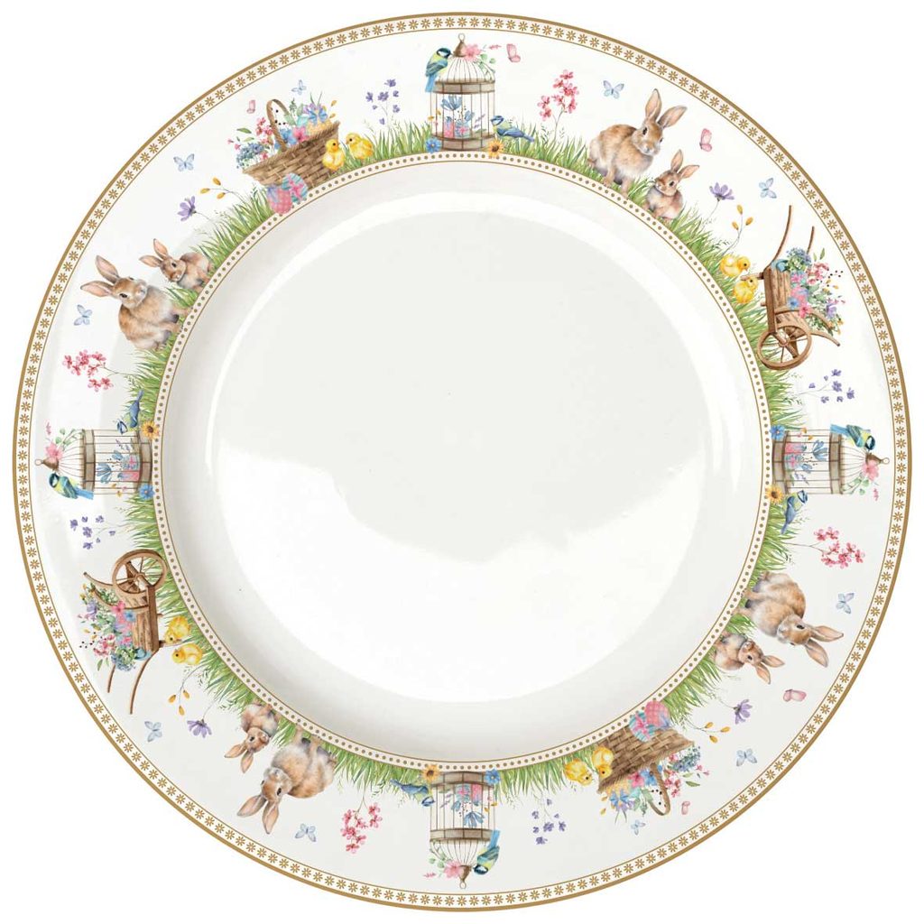 Elegantní porcelánový jídelní talíř z kolekce Spring Bloom od italské značky Easy Life ozdobený jemným jarním motivem s králíčky, květinami a přírodními detaily. Ideální pro slavnostní stolování i každodenní radost z jídla.