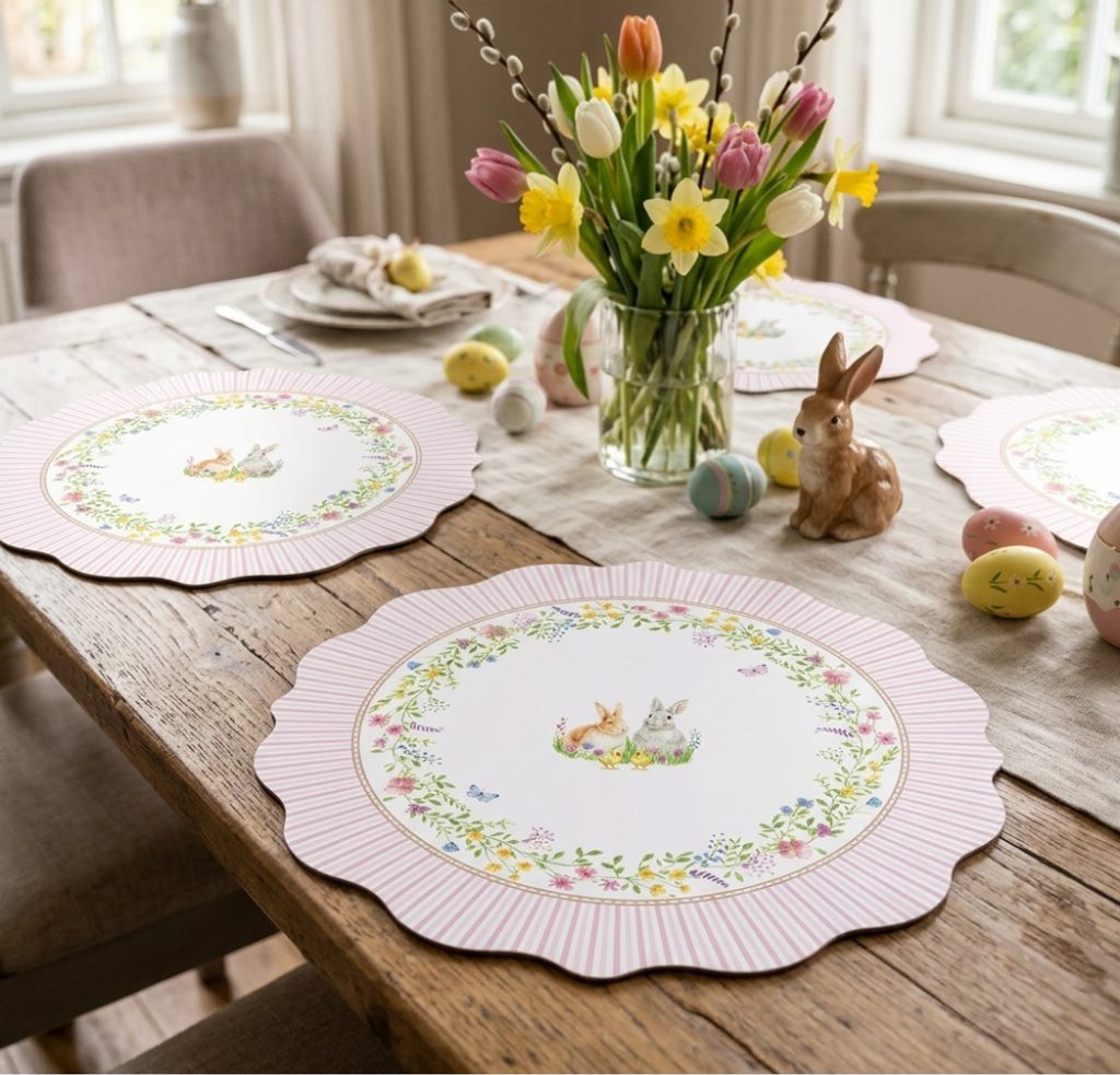 Sada dvou kulatých prostírání z kolekce Happy Easter od značky Easy Life vnese svěží jarní atmosféru na váš stůl. Jemný motiv zajíčků, květin a pastelových detailů dodává stolování elegantní a veselý vzhled. Praktické, snadno omyvatelné a ideální pro velikonoční i každodenní použití.