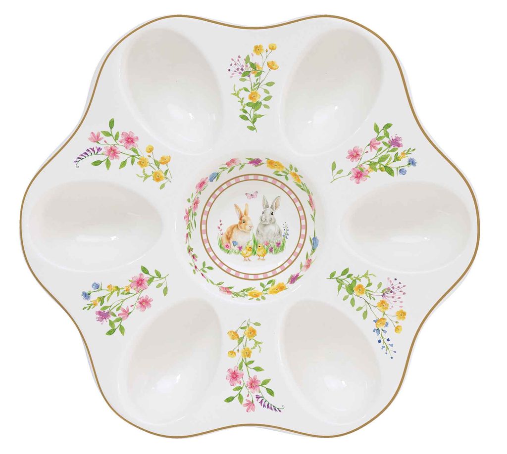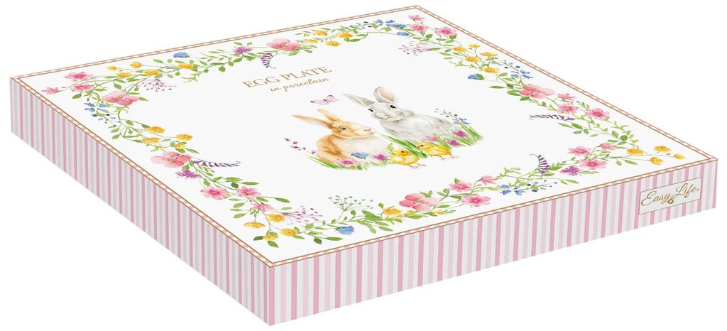 Porcelánová miska na vajíčka z kolekce Happy Easter od Easy Life je perfektním doplňkem pro velikonoční stolování. Elegantní design s jemnými květinami, pastelovými detaily a roztomilými zajíčky dodává slavnostní atmosféru. Ideální na servírování vařených vajíček. Dodáváno v krásné dárkové krabičce.