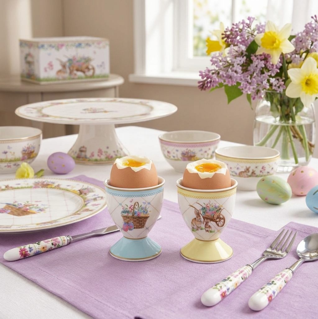 Sada dvou porcelánových stojánků na vajíčka z kolekce Spring Bloom od italské značky Easy Life. Jemné jarní motivy s králíčky a velikonočními dekoracemi v pastelových barvách. Dodáváno v elegantní dárkové krabičce – ideální pro velikonoční snídaně nebo jako krásný dárek.