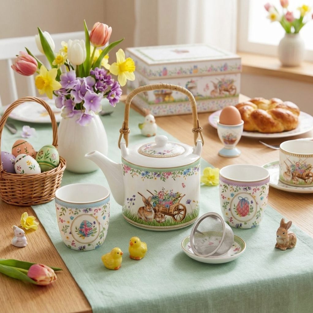 Elegantní čajová sada z kolekce Spring Bloom od italské značky Easy Life. Obsahuje porcelánovou konvičku s bambusovým držadlem, dvě šálky a nerezové sítko. Jemné jarní motivy s králíčky a květinami dodávají celé sadě romantický vzhled. Dodáváno v krásné dárkové krabičce – ideální dárek pro milovníky čajových rituálů.