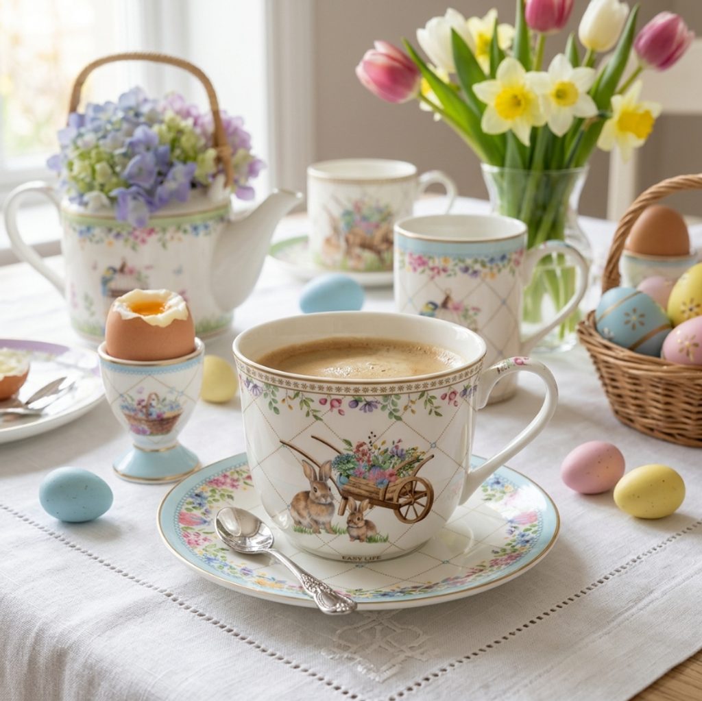 Snídaňový porcelánový šálek s podšálkem z kolekce Spring Bloom od italské značky Easy Life. Jemný jarní design s králíčky a květinovým motivem v pastelových tónech. Perfektní pro stylové ranní stolování. Dodáváno v elegantní dárkové krabičce – ideální dárek pro milovníky romantického designu.