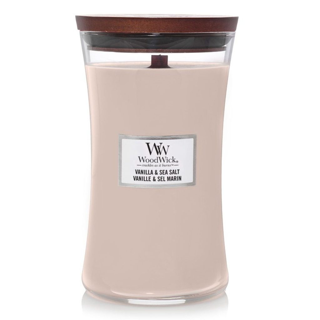 Vonná svíčka ve tvaru velké vázy s dřevěným knotem WoodWick s vůní vanilky a mořské soli. Vůně jemných květů vanilky s tóny mořské soli a jasmínu.