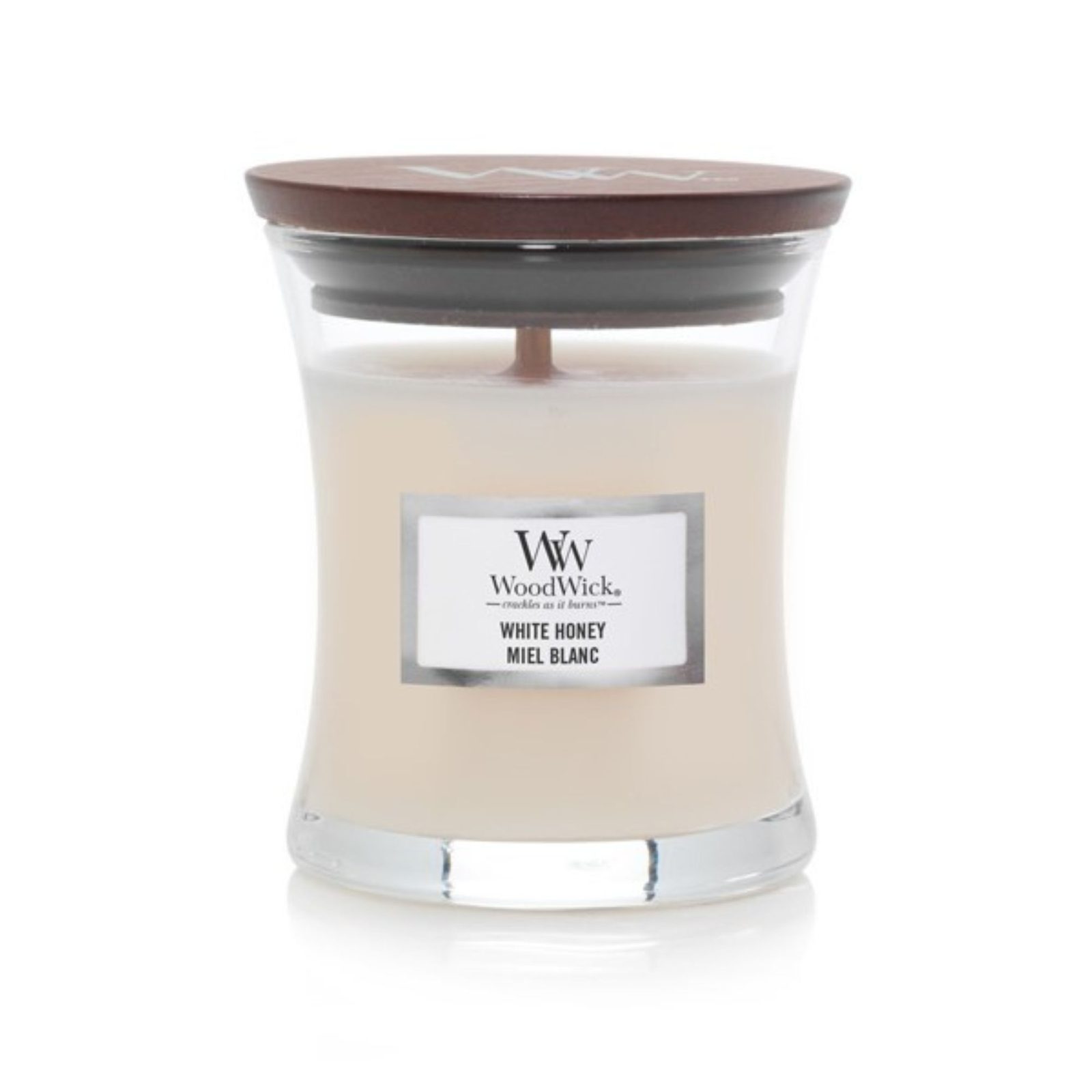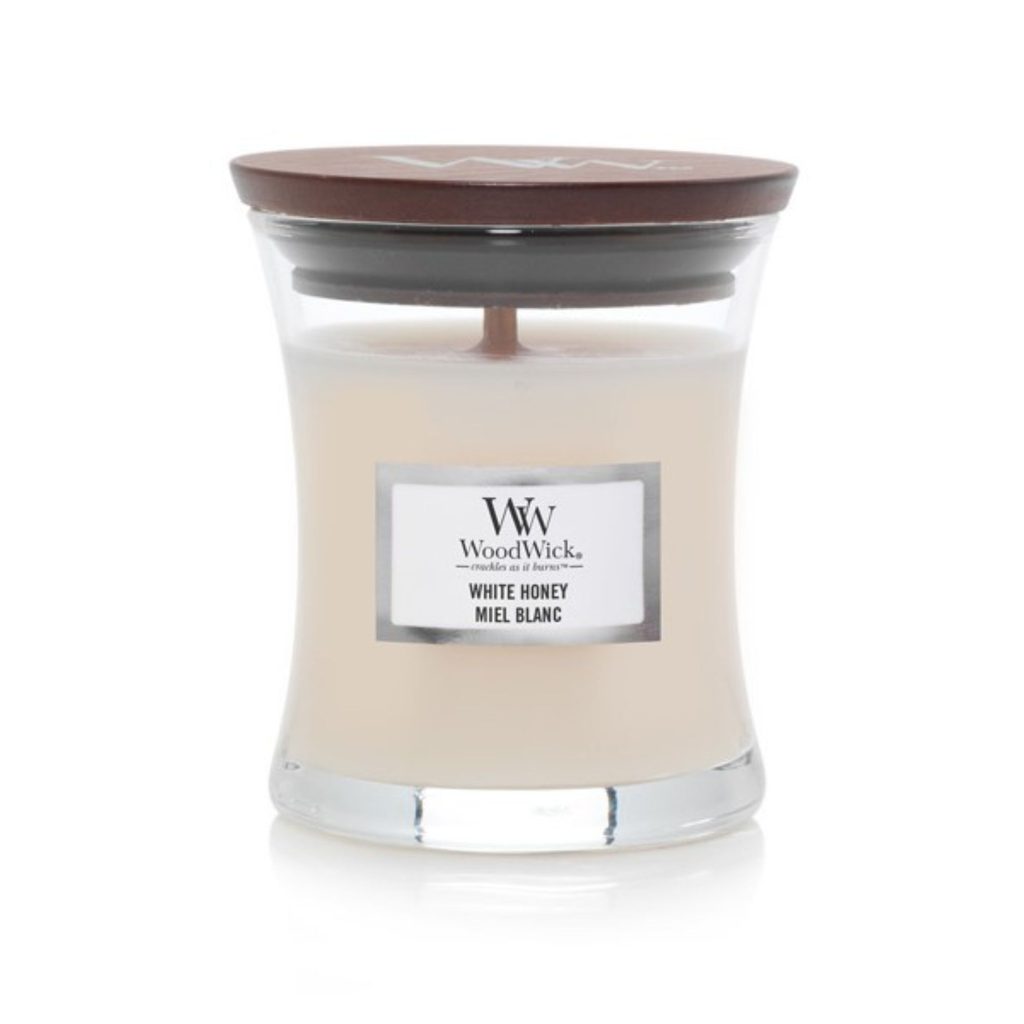 Vonná svíčka ve tvaru malé vázy s dřevěným knotek WoodWick s vůní bílého medu. Sladký kandovaný pomerančový květ s vanilkovou orchidejí a pečenou karamelovou tyčinkou.